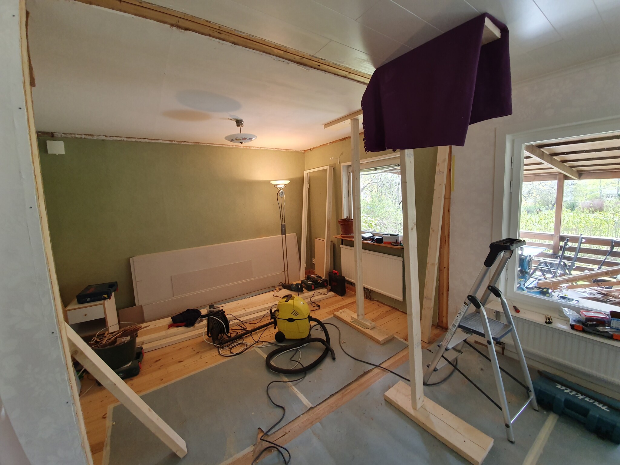 Jag växlade av under tiden, som allra enklast. La ut några rejäla reglar tvärs över golvbjälklaget både uppe och nere, och klämde in en liten regel däremellan. Mest för att golvet inte skulle sätta sig ännu mer, jag var aldrig rädd för att det skulle trilla i huvudet på mig.R Roald.A skrev: