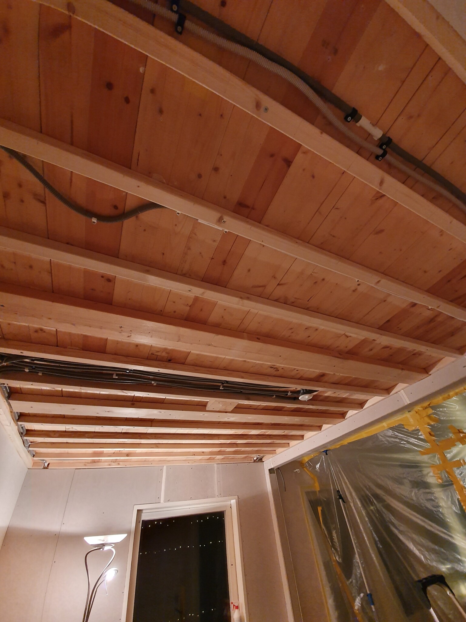 Värt att nämna kan vara att vi passade på att regla ner taket när vi ändå höll på - dels för att stadga upp ytterligare (45x170, ca en per meter. Skruvade med 8x240-skruv ovanifrån, en per element - men kan också skruvas underifrån, exempelvis med 6x90 (men då kanske två skruv per element)), och dels för att kunna dra elen i taket. Resterande 45x45 var bara för att enklare kunna sätta upp paneltaket.