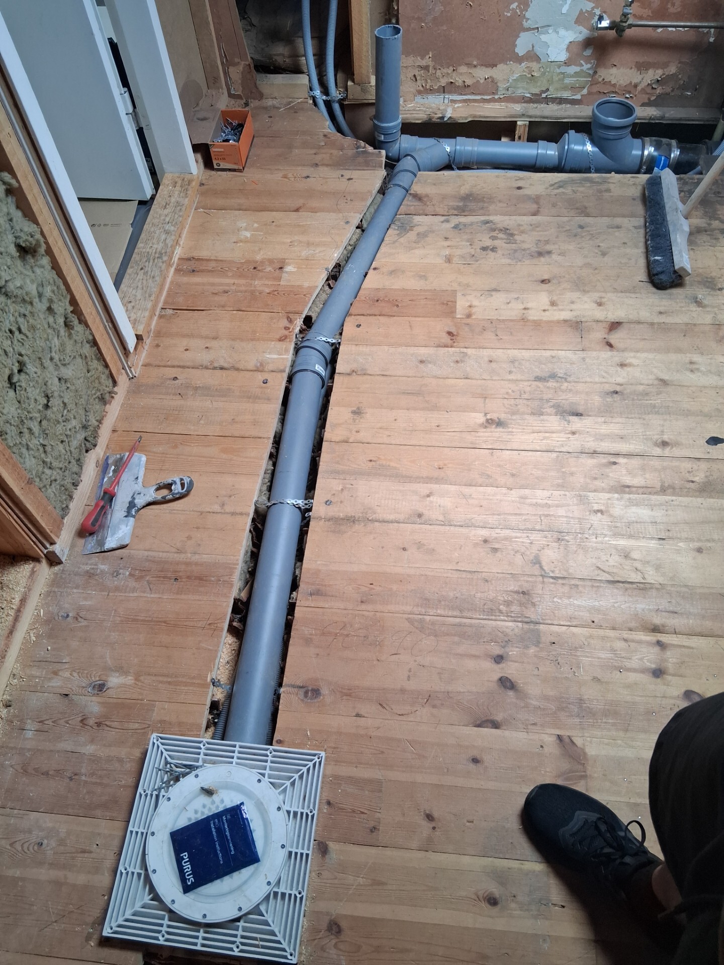 Jag rev innanmätet i alla element i badrummet på ovanvåningen, reglade upp nytt bjälklag ända ut till hammarbandet på ytterväggen.