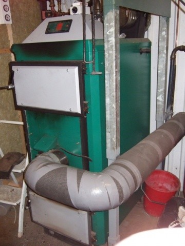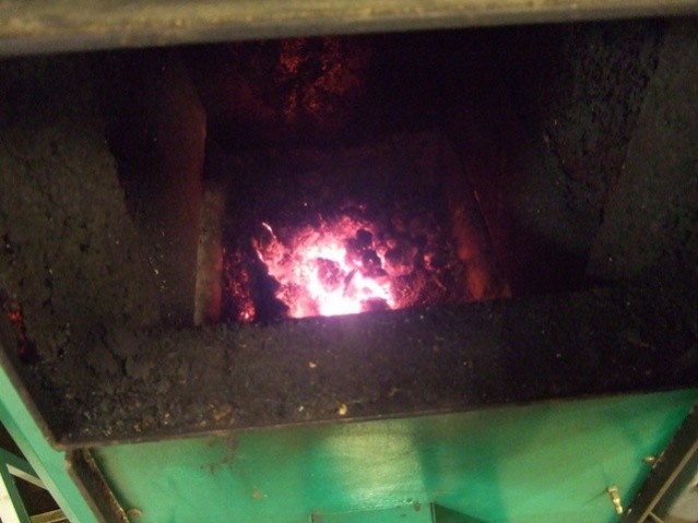 Det fungerar bra och den glödhög som ses, brinner sedan sakta ned. Jag har ett återvinningskoppel som hämtar den sista värmen från pannan.