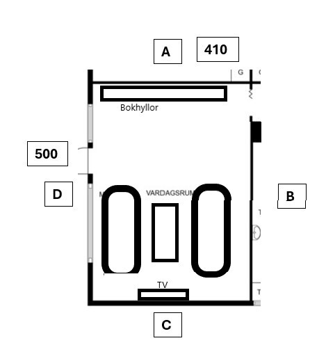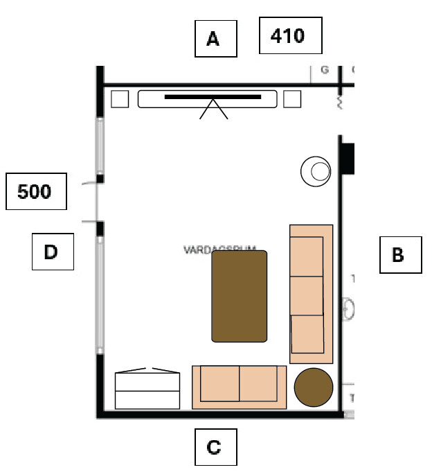 Vi vill få plats med en soffa och TV. Inte omöjligt alls eftersom det är gott om plats, men hur skall vi ställa det?