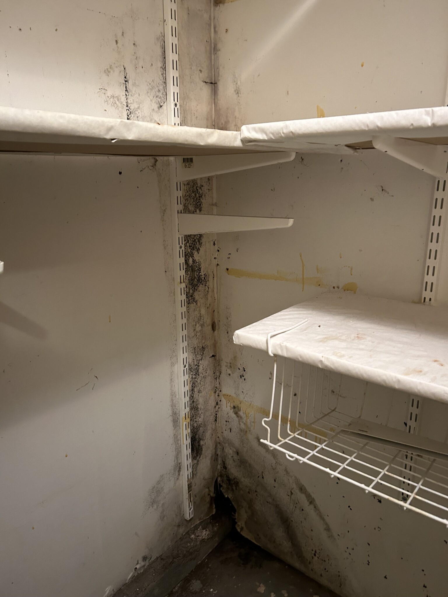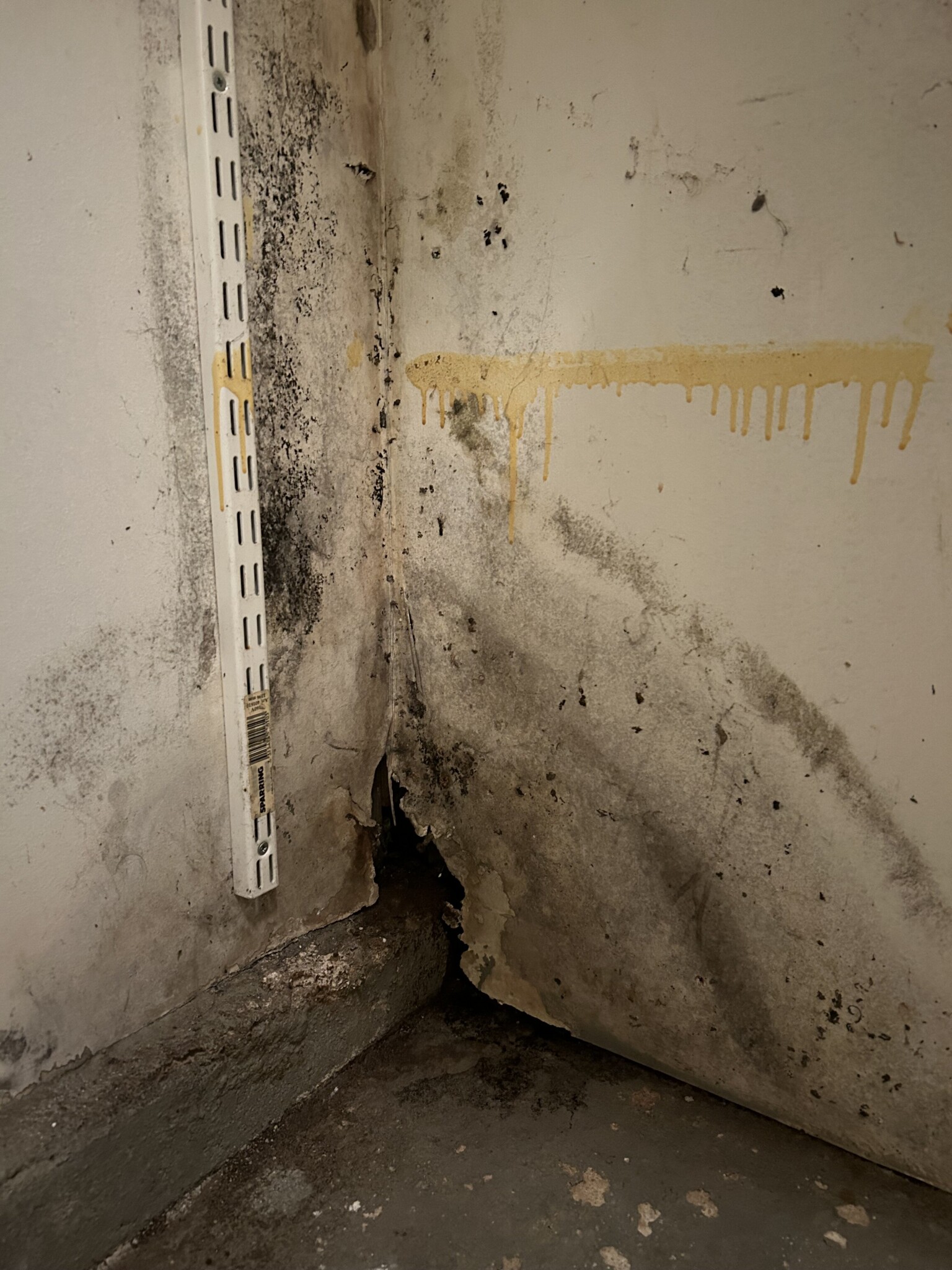 Jag ska se om det går att tvätta bort. Det är ett förråd ovanmark. Det har stått mycket grejer här så nu ska vi försöka ha det luftigare. Det stora mögelområdet ska jag be en firma om hjälp. Det är kanske enklare att se vad som orsakat det om man tar bort delar av väggen. Jag kan inte se något konstigt på andra sida väggen. Det sitter en ventilationsventil ovan. Kanske runnit in vatten?