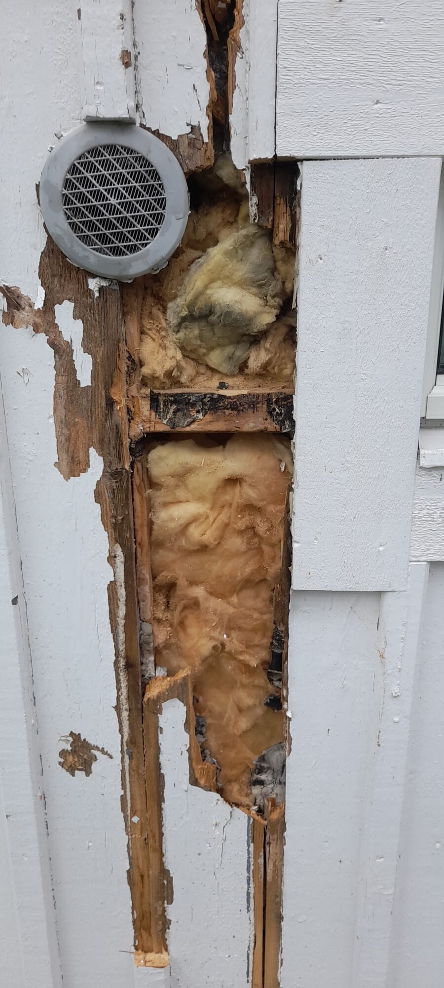 Sedär. Där kom den. Det ser onekligen murket ut. Men är det en vägg det normalt regnar på. Tänker att det kan vara en dålig rörgenomföring som inte tål regn så bra, som är orsaken till skadan. Någon onormal mögelmängd ser i alla fall inte jag.