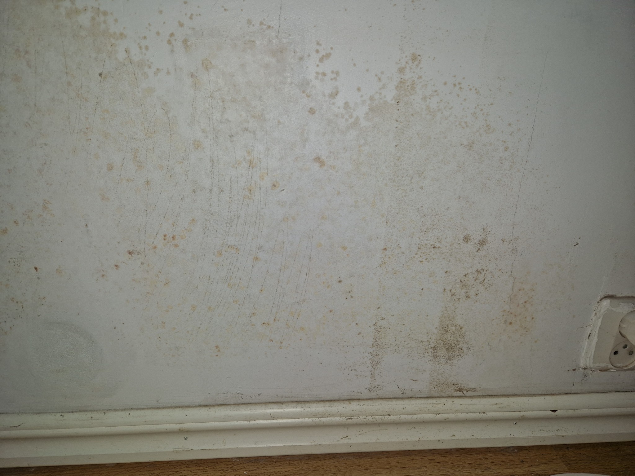 Har storstädat idag och flyttat sängen. Väggen bakom sängen ser ut enligt bilden. Är det mögel? Kan jag lösa det själv med t.ex. någon spray/medel? Kan även nämna att det var väldigt dammigt, kanske har det en påverkan.