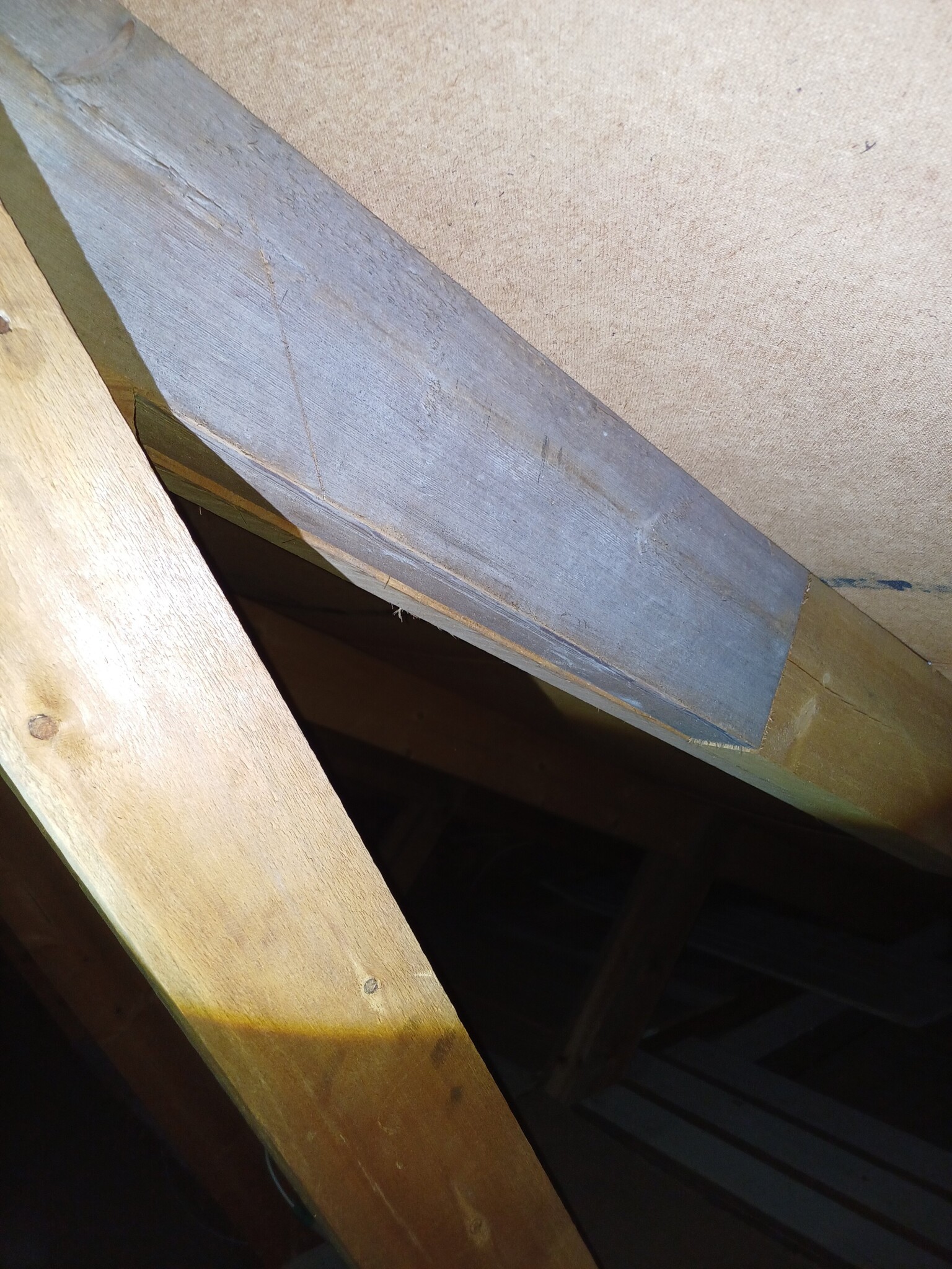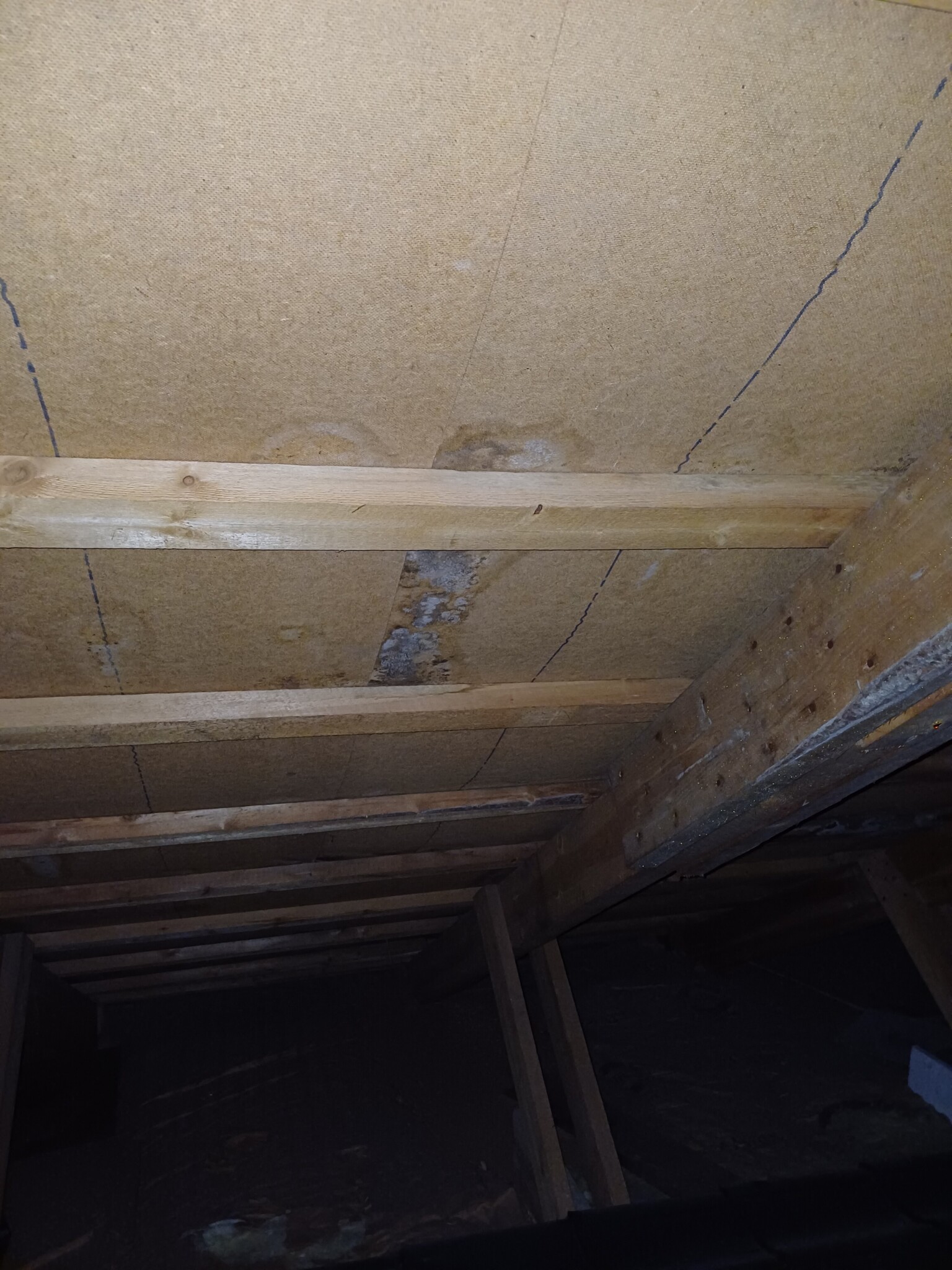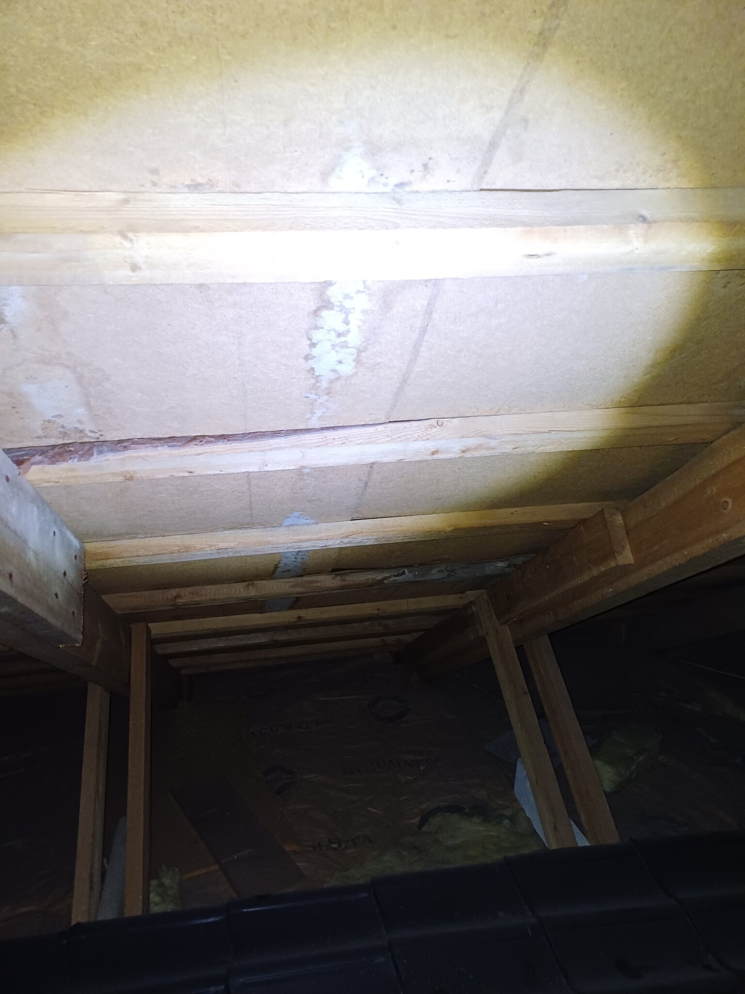 Vi bor i ett 60-talshus med kallvind och platta på mark. Vi upptäckte en avvikande trälukt i ett av rummen här om dagen och har då letat orsak till detta. Inspekterade vinden och upptäckte då fläckar enligt ovan på delar av vinden. Vi är uppe på vinden ca en gång i månaden och har inte noterat detta tidigare. Vi har tidigare noterat små läckage från taket vid kraftig snö/regnstorm men däremellan har det varit torrt. Senaste månaden har det varit kraftig värmebölja här med några kraftiga regnskurar, kan det påverka? I övrigt har vi installerat en kamin för några månader sedan men möglet är inte tydligt lokaliserat runt skorstensröret.