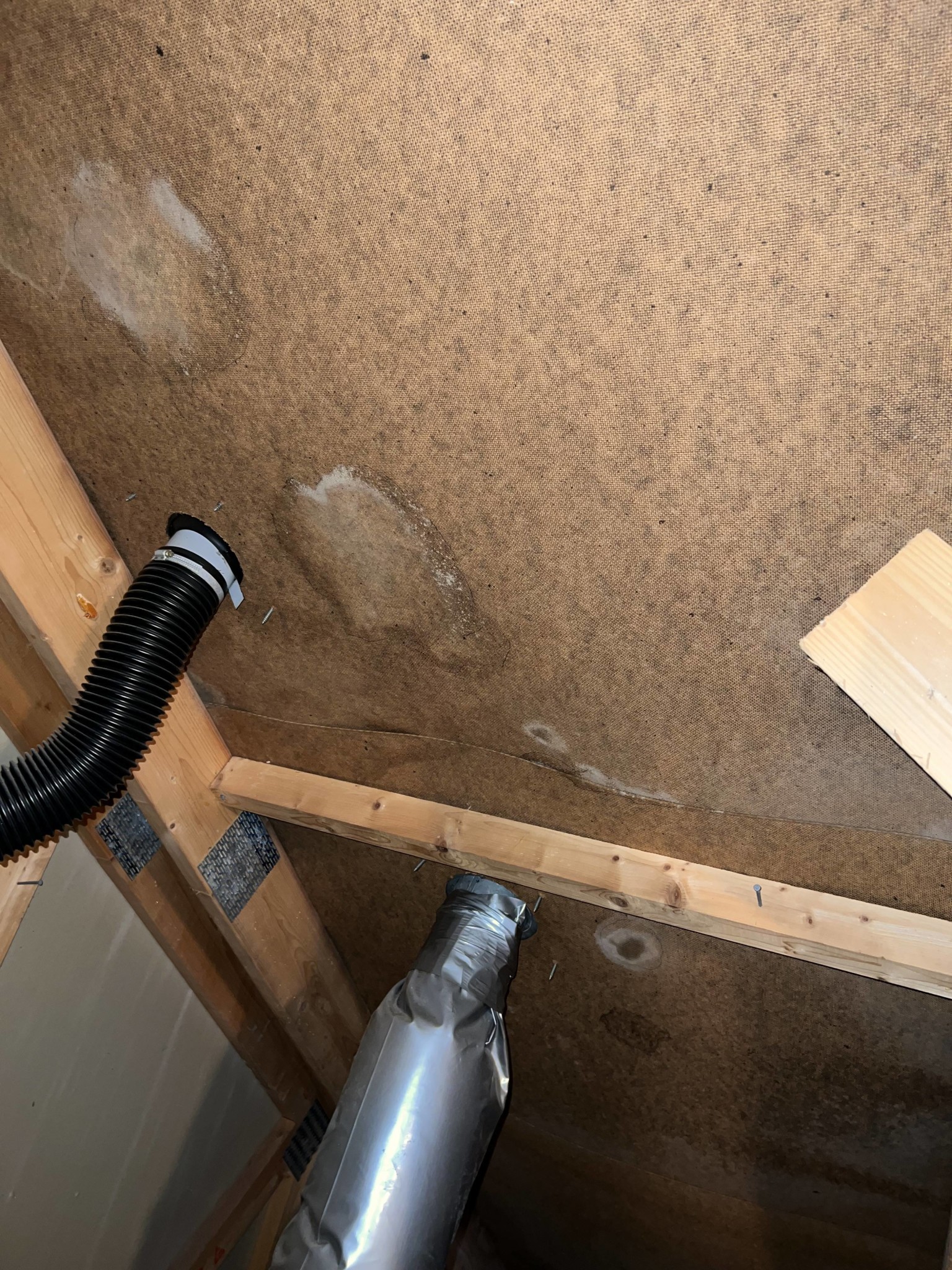 Bifogar även en till bild på en annan del av vinden. Flera personer "inom hantverksbranschen" tycker inte det ser ut som mögel när dom varit uppe på vinden tidigare år, utan trott på någon slags kondens, smuts, eller ifrån isoleringen som ligger löst på golvet (kommer ej ihåg vad det heter). Men den bilden där man ser fläckarna och rören gör mig väldigt misstänksam om just det specifika stället är vitmögel.