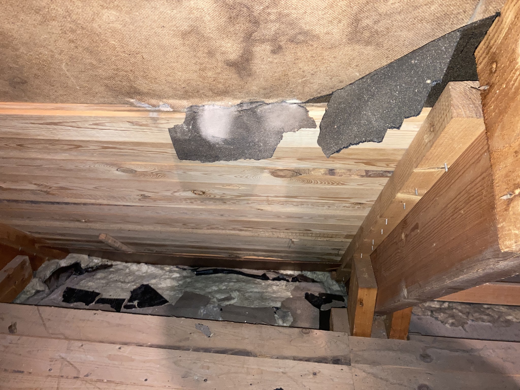 Hur som helst. Var uppe på vinden innan och såg att det var en lite rosaktig fläck på en bit takpappen som hänger ner. Kan inte minnas om den varit där förut. Ber om ursäkt för dålig bild. Så min fråga: kan detta vara mögel och kan det i så fall verkligen växa på takpappen (och bara där)?