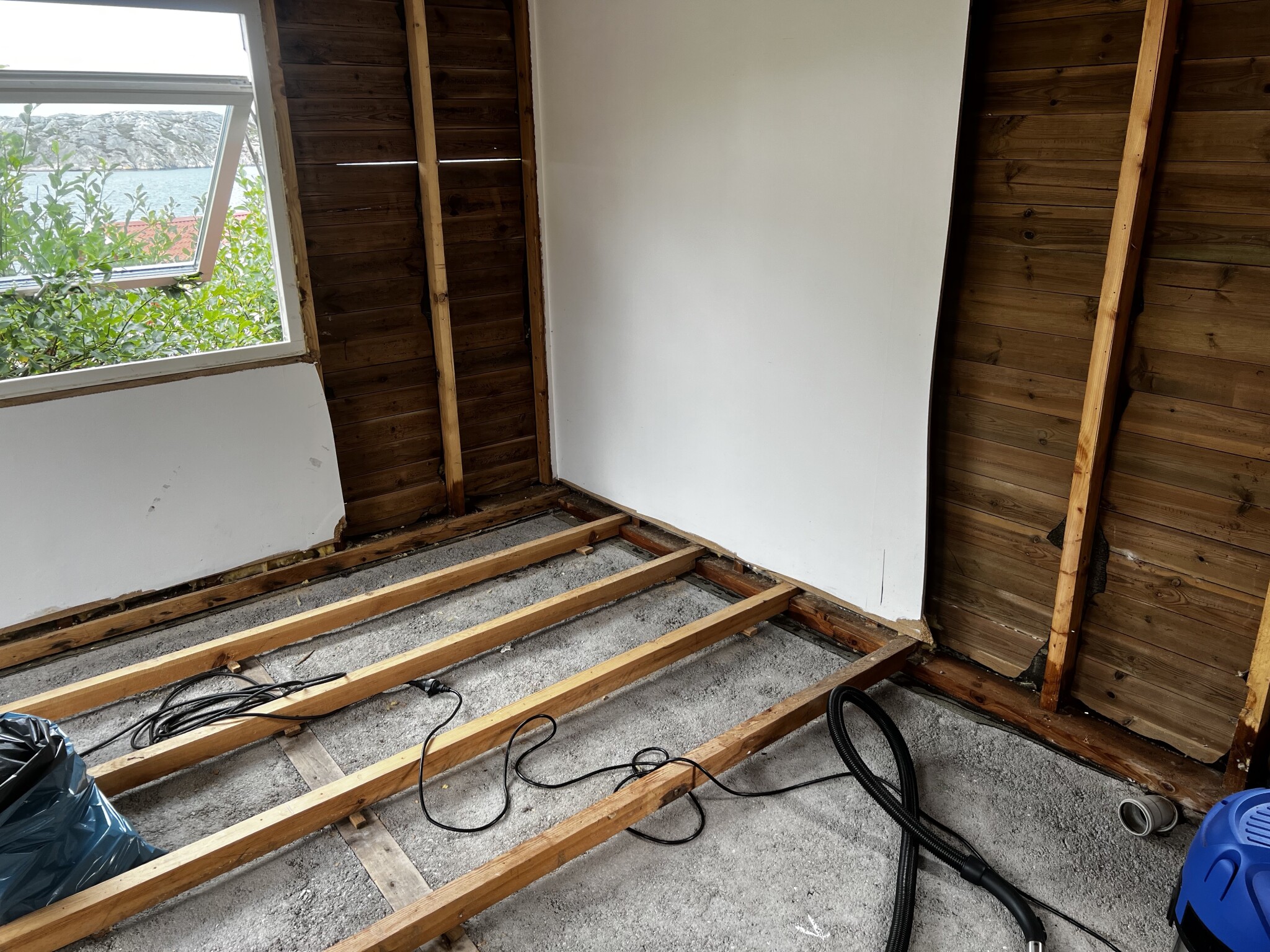Det verkar inte bättre än att min käre morfar, som byggde stugan, hade lagt tjärpapp och glasull direkt på betongplattan (byggnormer var inte hans starkaste gren). Jag fortsatte att plocka bort mer golv för att bara hitta än mer mögel. Innerväggarna rök för att komma åt bättre. Även vissa av reglarna i golvet var mögelangripna och fick hivas ut..
