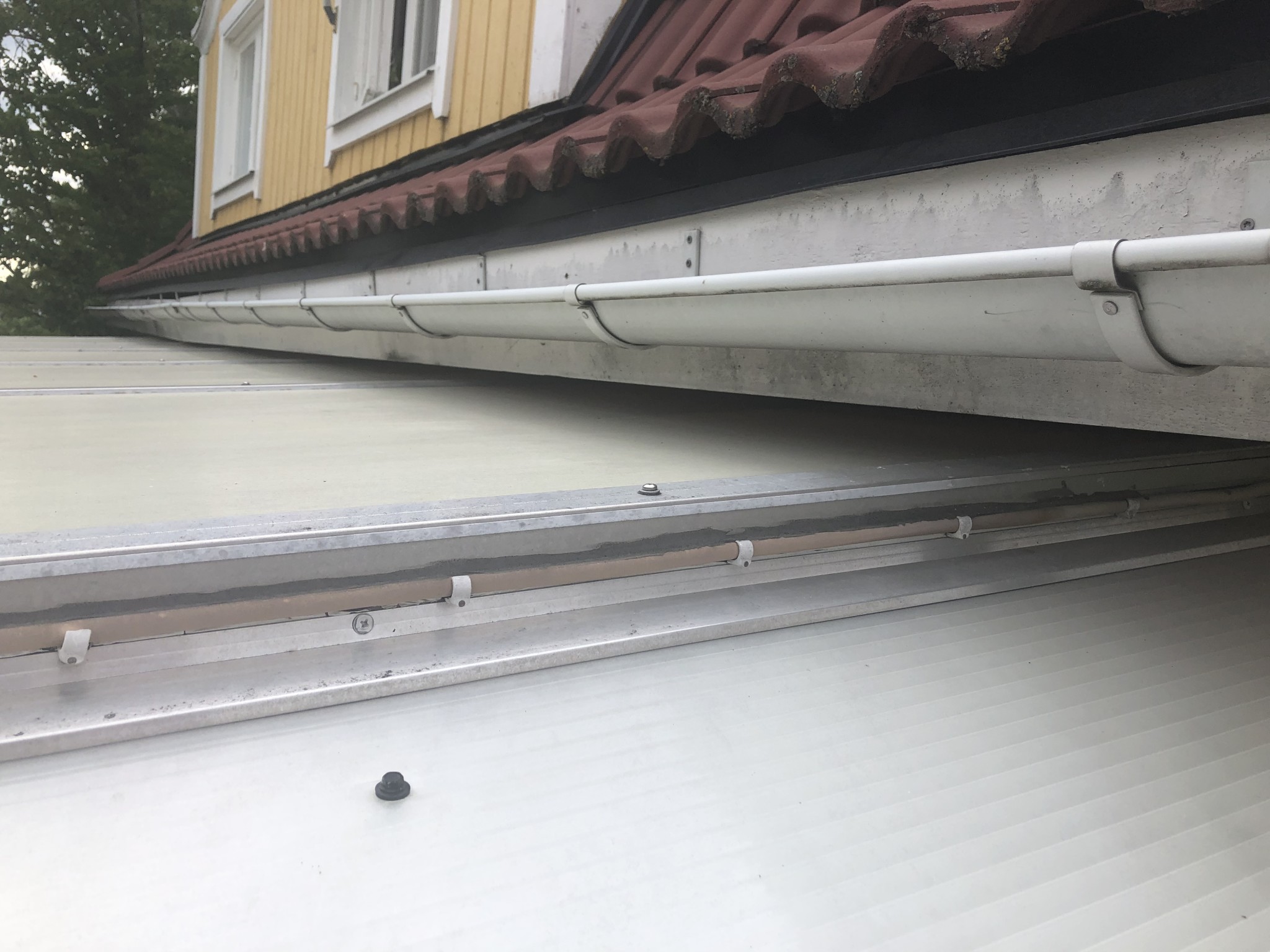 hus ägare sedan ett år tillbaka och fick höra av tidigare ägare att det läkt in vatten någon gång då och då ifrån taket mot vårt uterum, har inte märkt något av detta hittills men den förra ägare misstänkte att det kunde vara nät snö töade på uterumstaket, och vintern var mer eller mindre obefintlig denna vintern.. men tänkte tills nästa vinter se om man kan göra något mot detta.. har ni något förslag? Se bifogad bild på hur det ser ut mot fasaden