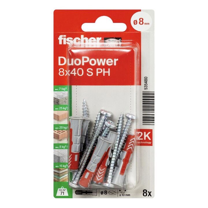 Frågan är om det räcker för att klara belastningen? Skenan är ju styv och skulle sitta med 4 st 55 mm skruvar i Fischer DuoPower plugg 8 x 40 mm. Jag tror att väggen bakom är tegel – ljust rödbrunt damm från borrhålen. I sådana fall skulle jag komplettera med att limma skenan med några droppar Casco Superfix+ montagelim också.
