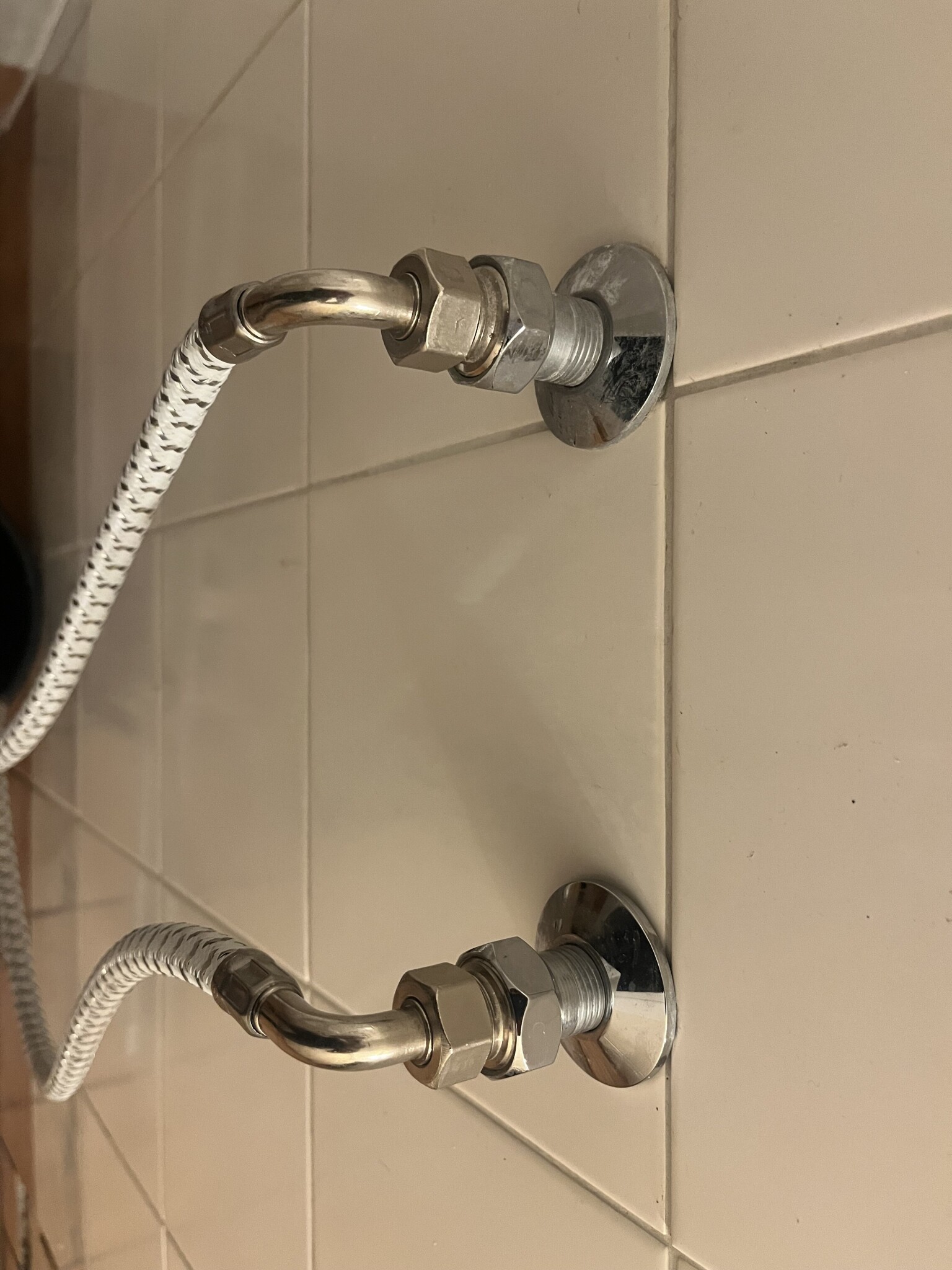 Jag har plockat ut duschkabinen och vill sätta tillbaka duschblandaren på fästet men blir inte klok på anslutningen. Det är 160cc mellan fästena och håller jag fästet mot duschblandarens så centrerar hanarna mot varandra.