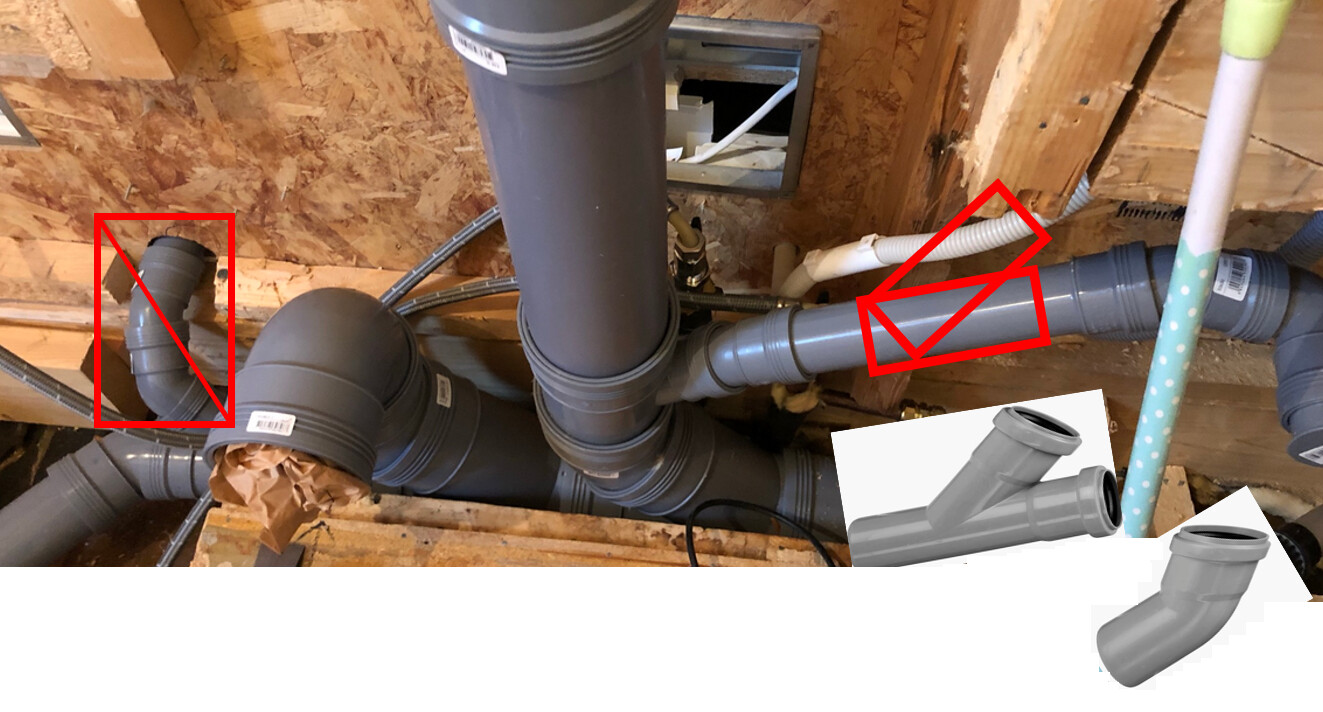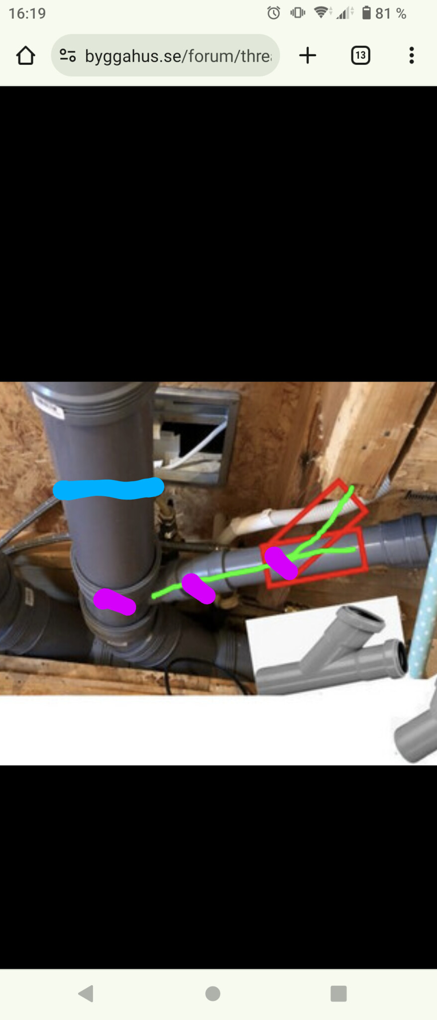 Men det går kanske ändå kapa vid blå markering, och sedan byta delarna med lila markering till 75mm motsvarande och sen få ihop det vertikala röret med en skjutmuff eller fernco-gummikoppling.