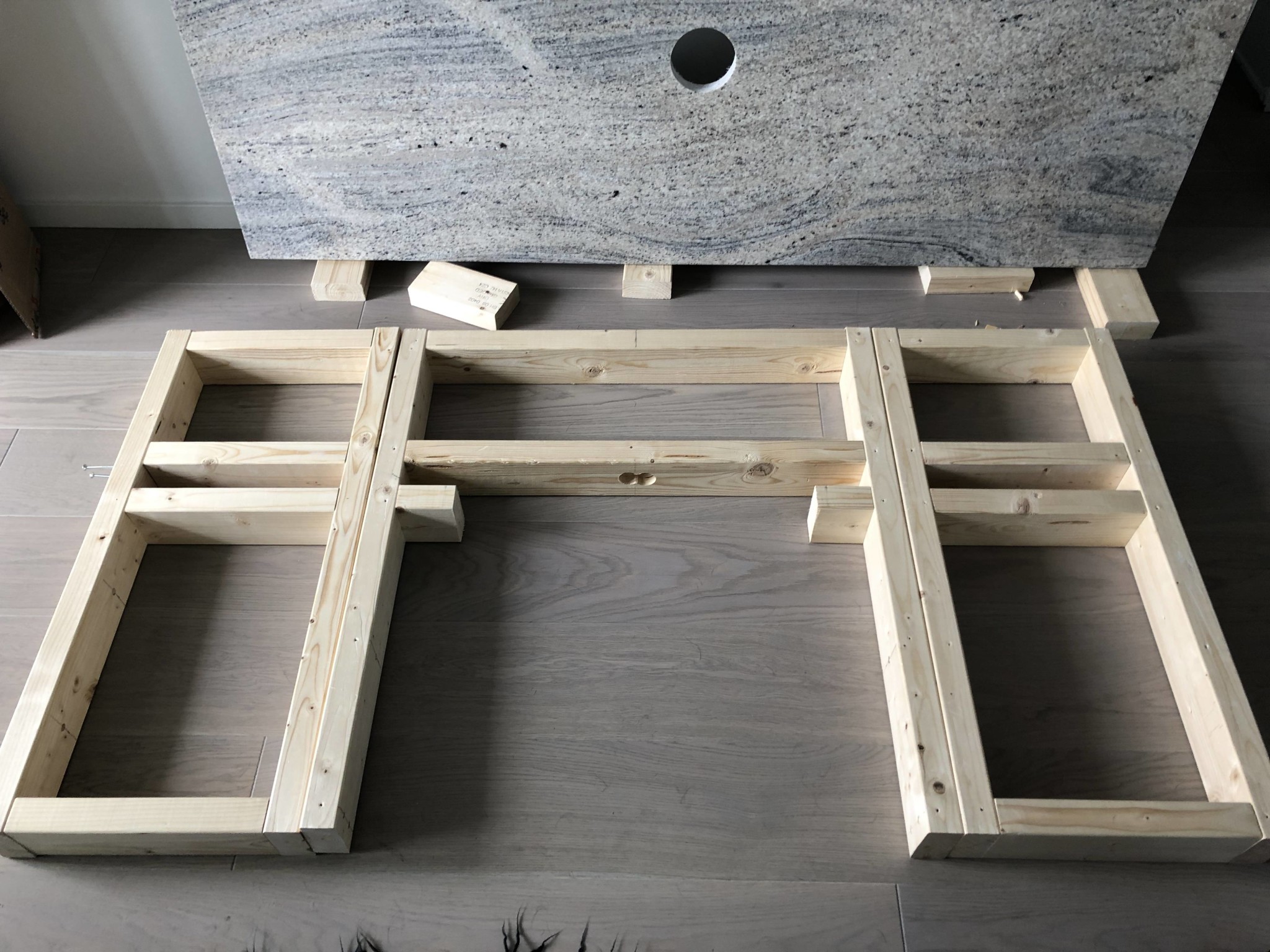 Ett tredje alternativ är bygga upp sockelramen till köksön av annat material, t.ex. av spånskivor, plywoodskivor eller liknande. Kapa dessa i 92-93 mm och skruva ihop dem. Dock är ju regelvirket stabilare naturligtvis pga sin tjocklek. Plyfa eller spån, MDF och liknande skivor är ju knappast 45 mm tjocka som reglarna är.