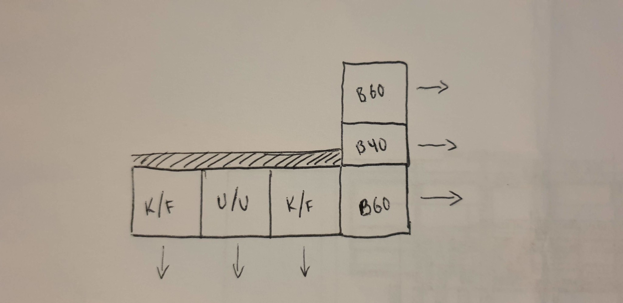 Problemet är att bänkskåp "B60", som sitter med ryggen mot ena högskåpet, har ju benen "längre ut" jämfört med högskåpen (eftersom det är vänt), så här: