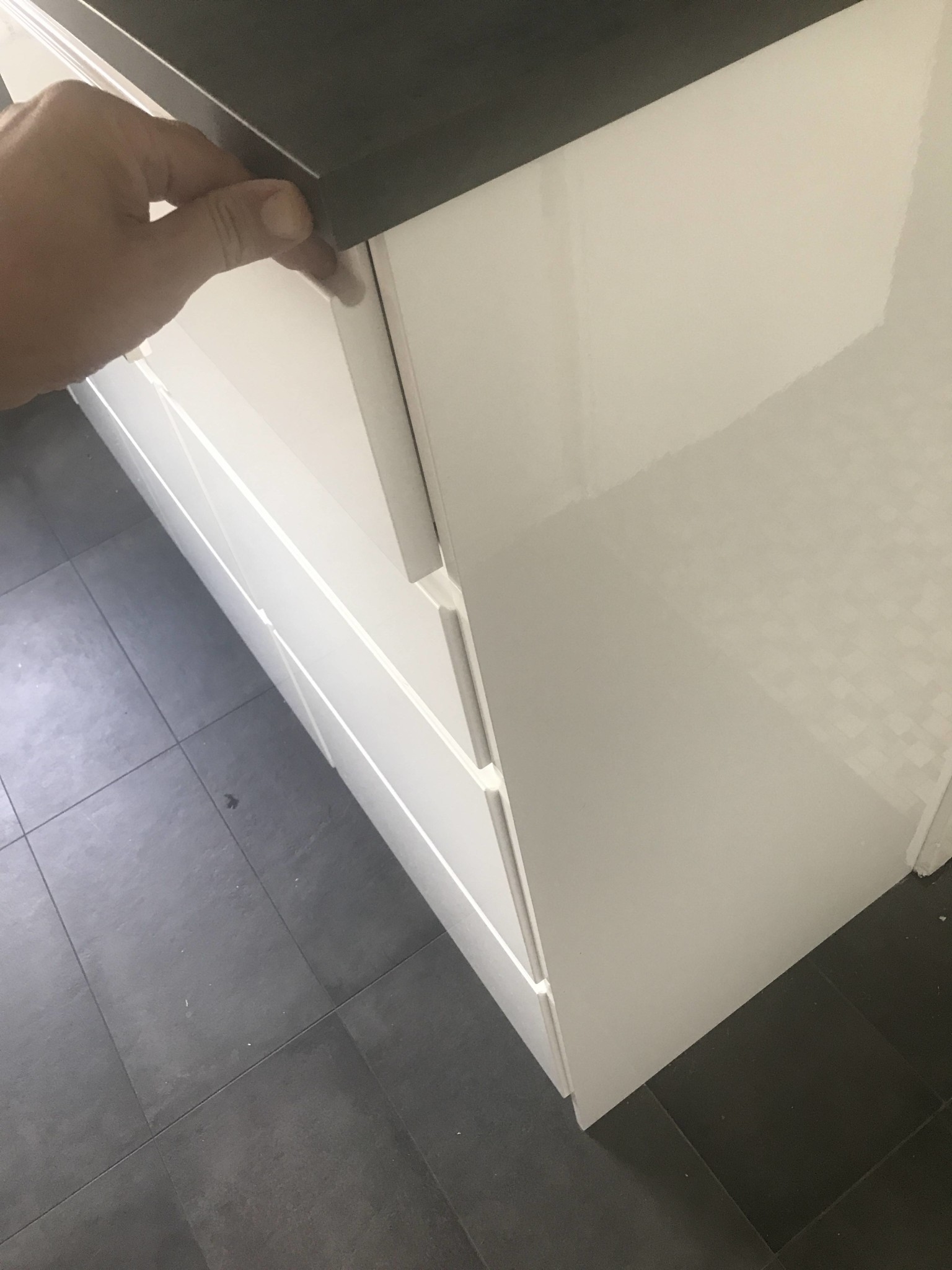 Hur sjutton är det tänkt att man ska sätta en täcksida här? Täcksidorna är 615mm (inte 620 som IKEA säger), vilket lämnar 25mm över på lådöppningssidan (ska vara typ 17mm). Den enda lösningen jag ser här är att kapa skivan till 607mm och lägga en silikonsträng mellan den fula kanten och högskåpet. Låter det vettigt?