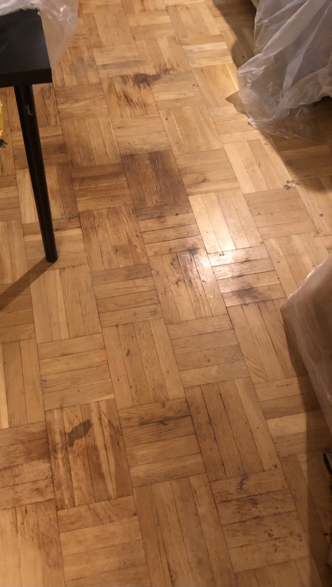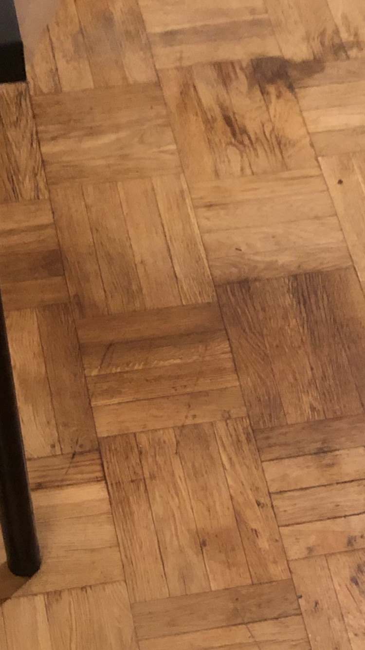 Jag har fått mörka fläckar på mitt parkettgolv, och speciellt där jag har haft min datorstol. Där är det som att lacket har försvunnit och golvet blivit mörkt och repigt. På dom andra fläckarna antar jag att jag har spillt något.