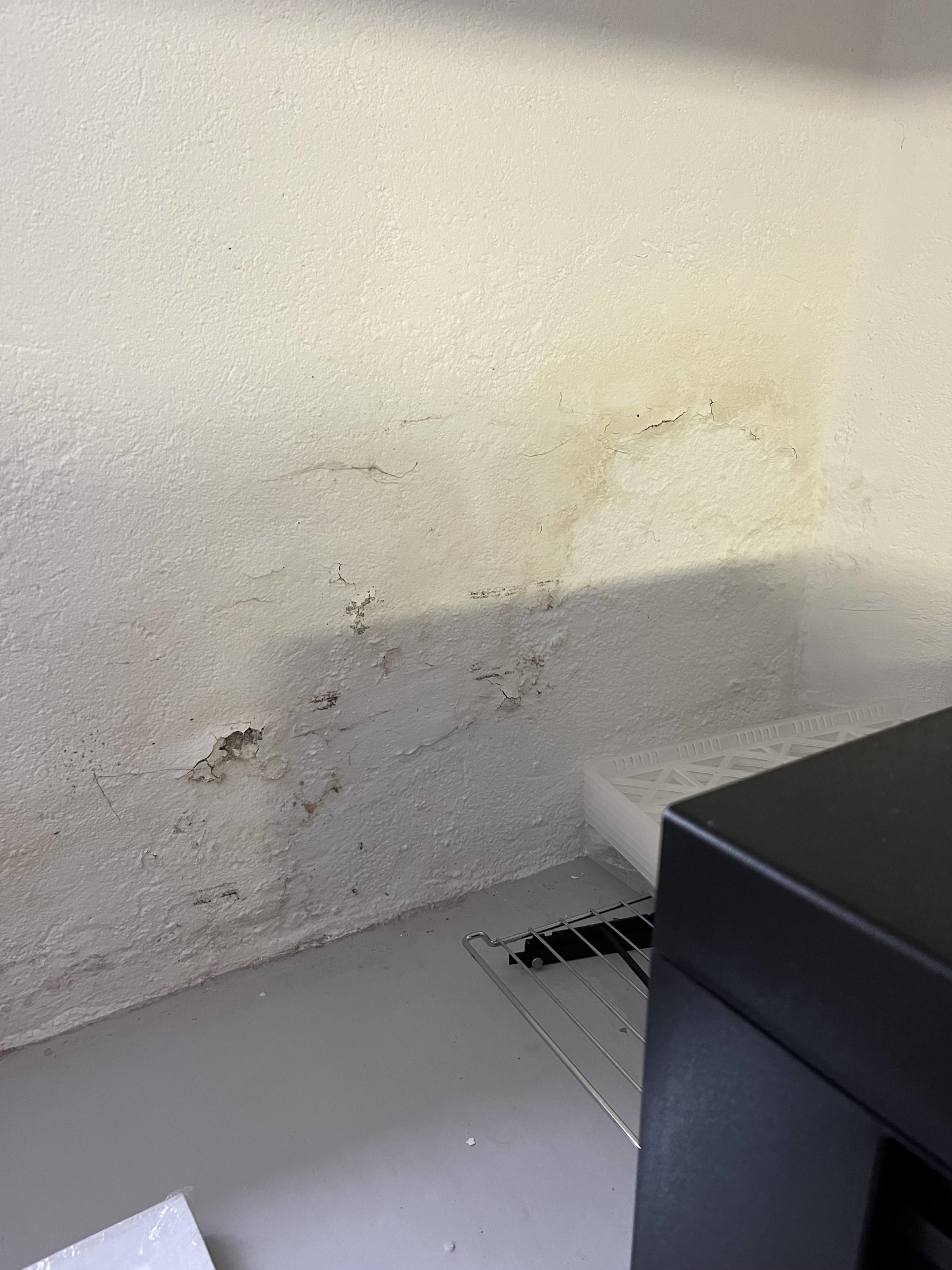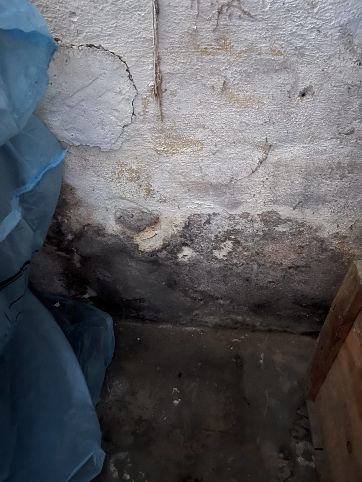 Den mörka väggen är garanterat gammal och det har nog stått grejer tätt intill väggen, den vita kan vara sedan efter dräneringen.