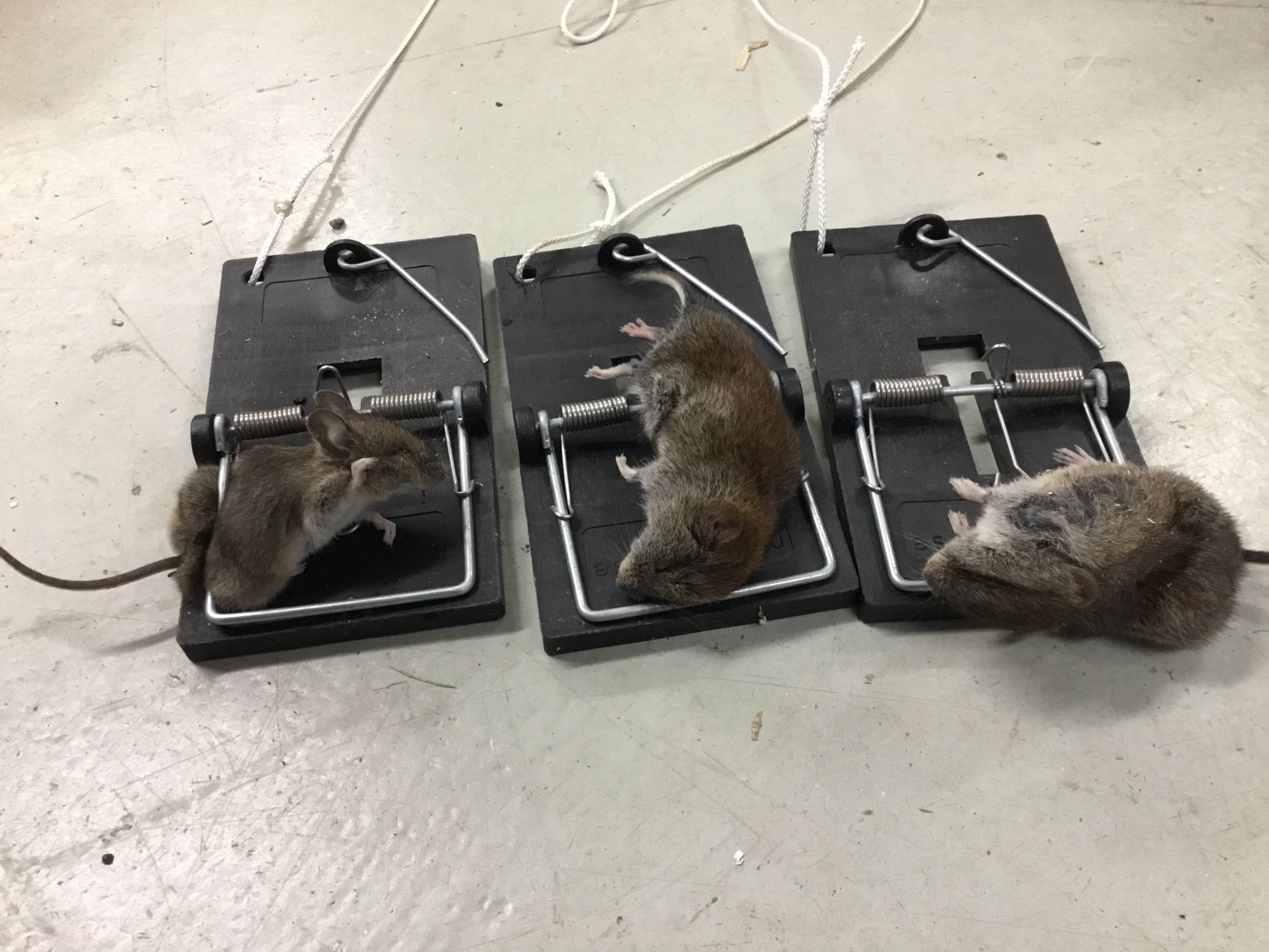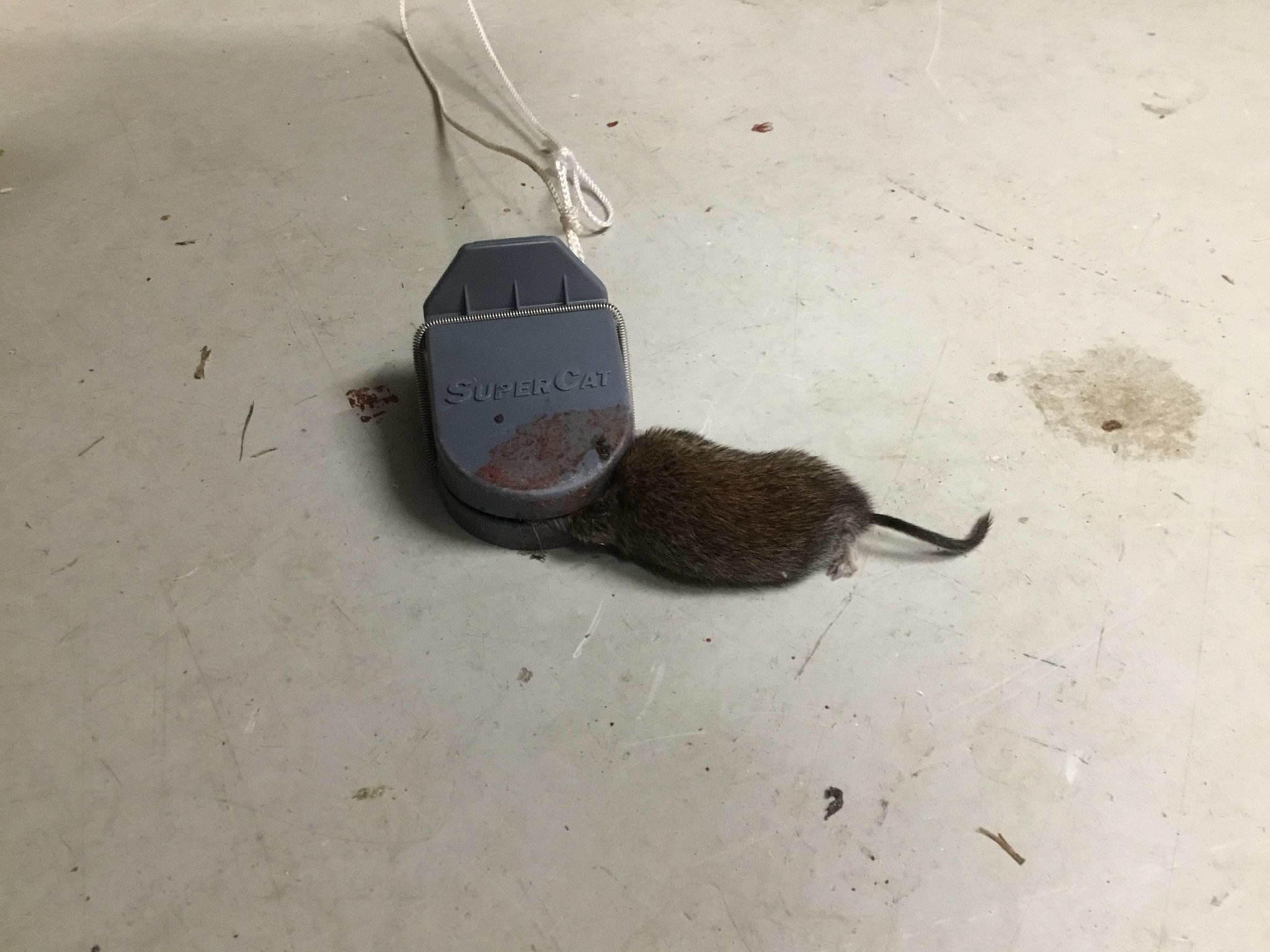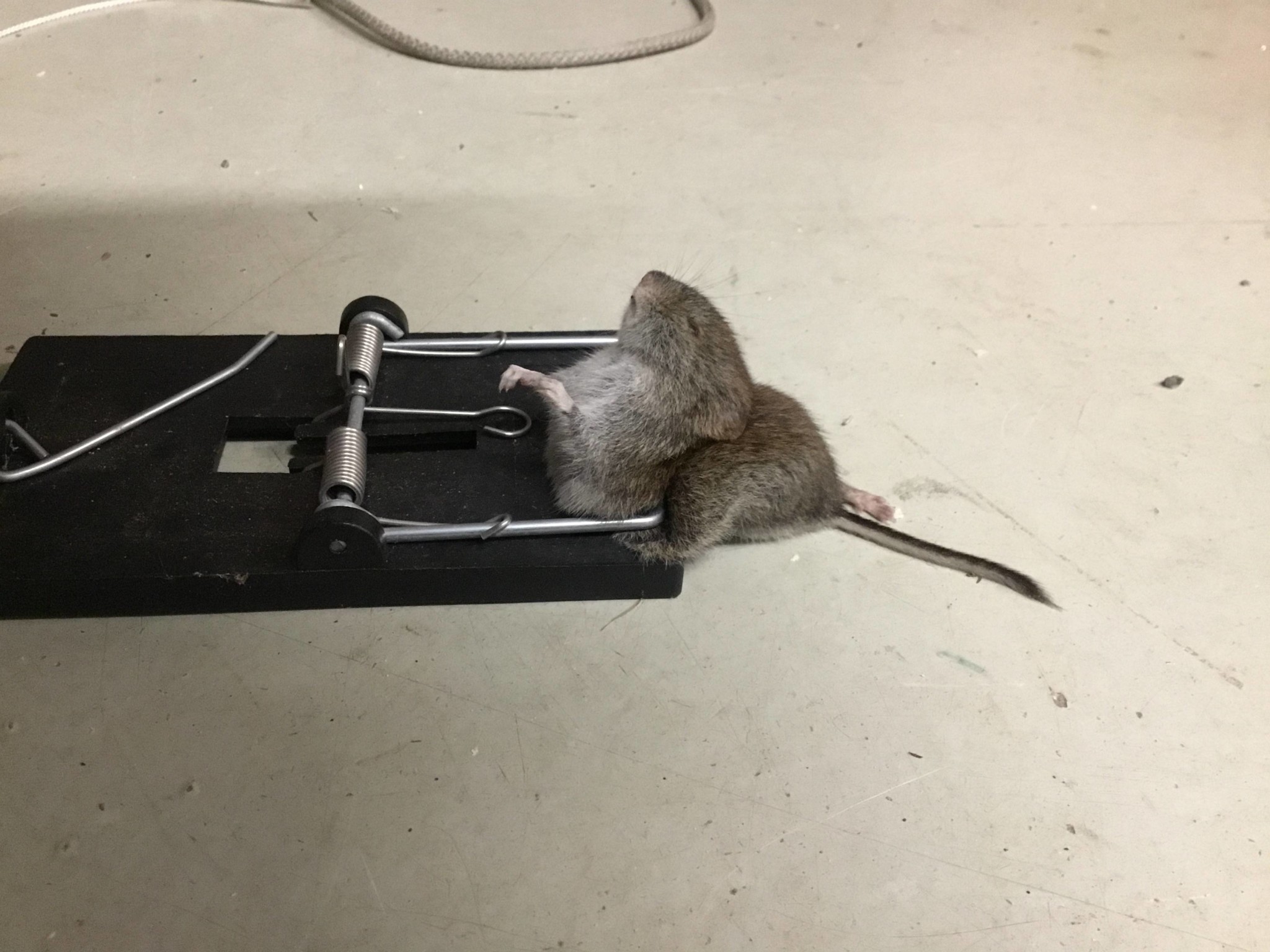 Men det som inte ska hända hände, en av mössen hade bara fastnat med ena tassen och låg där och sprattlade så den fick jag slå ihjäl manuellt. Men den är ju färskare då.