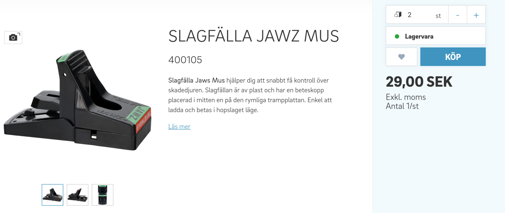 Vet någon var denna fälla kan köpas i Sverige? Den heter Jawz och jag tror den tillverkas i USA. Länsförsäkringar ger ut dessa och de är helt fantastiska. Överlägsna allt annat jag prövat men Länsförsäkringars ranson räcker inte. Ställer två stycken åt vardera håll i en avlång trälåda (typ råttgiftlåda) med hål i vardera ände och många av mössen fångas inte mitt i måltiden utan när de springer igenom lådan. Alltså kring 95 % död mus-garanti jämfört med andra lösningar. Resterande procent får man hjälpa över till andra sidan med lämplig metod…