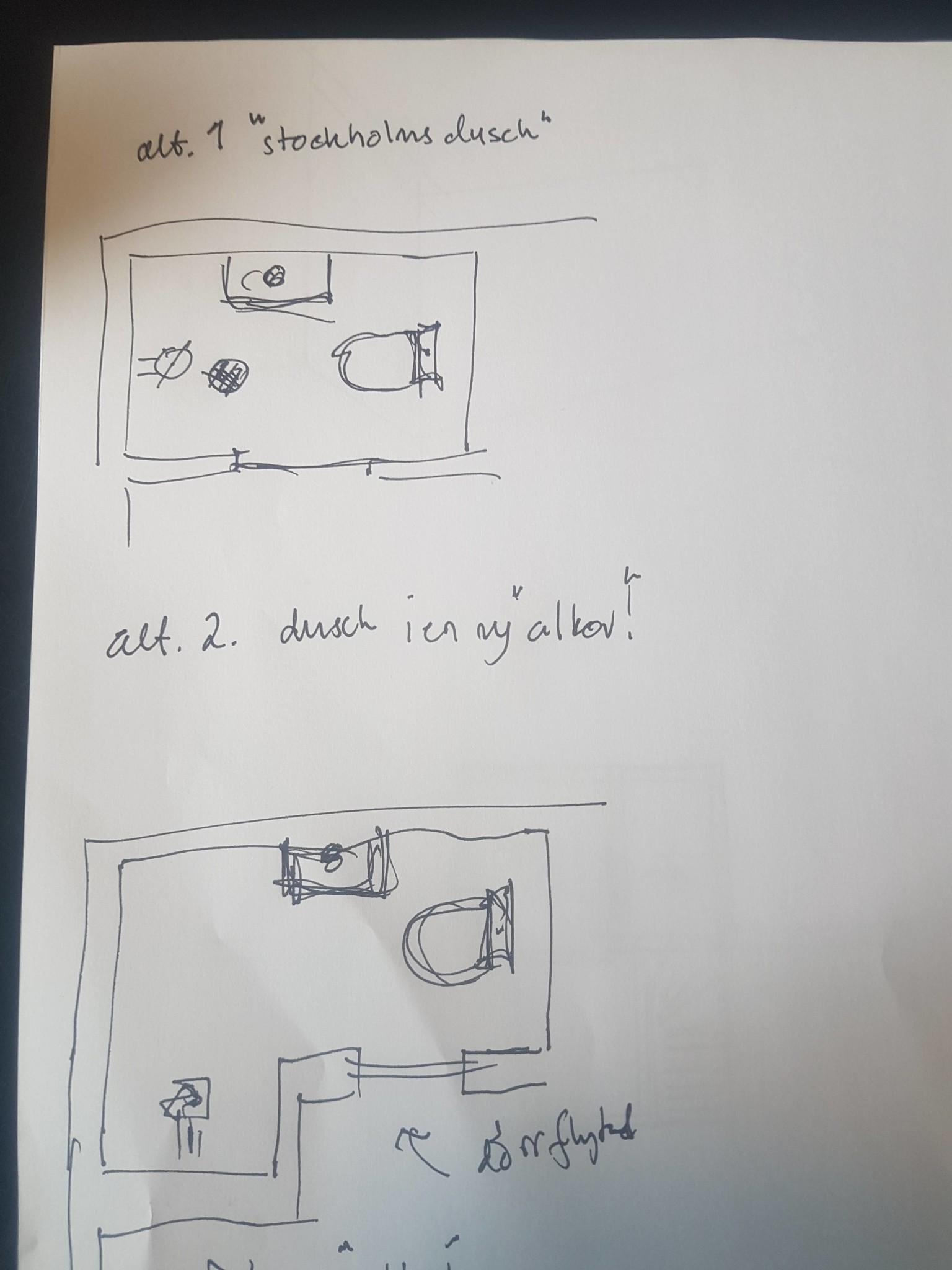 Såhär kanske? Kan du ju även ha en så dusch där du viker in dörrarna, så tar det inte mycket platsP perlundstrom skrev:Det lutar åt att att bygga toa + handfat på den högra kortsidan ifall det går att få in ett mycket litet handfat eller hörnhandfat. För att då ha en "stockholmsdusch" direkt där man kommer in på toan. Kanske med ett vanligt duschdraperi som man drar för dörren så den inte blir blöt.