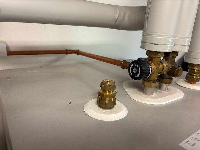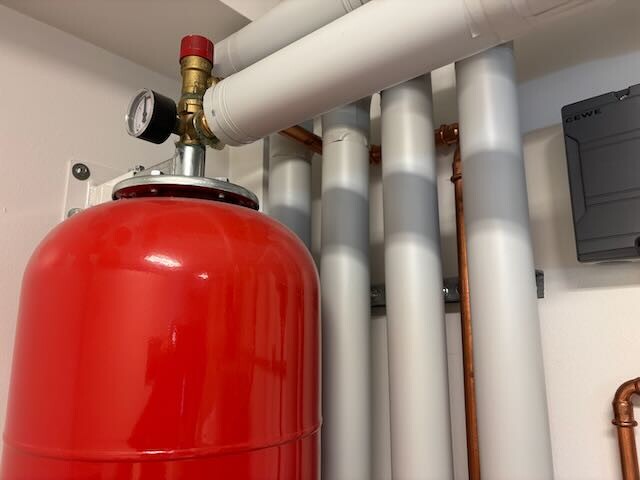 För att fylla expansionskärlet igen fyllde jag på lite vatten och sen pyste ut luft ner till ungefär 0,5 bar. Sen fyllde jag på vatten med påfyllningskranen till 1 bar.