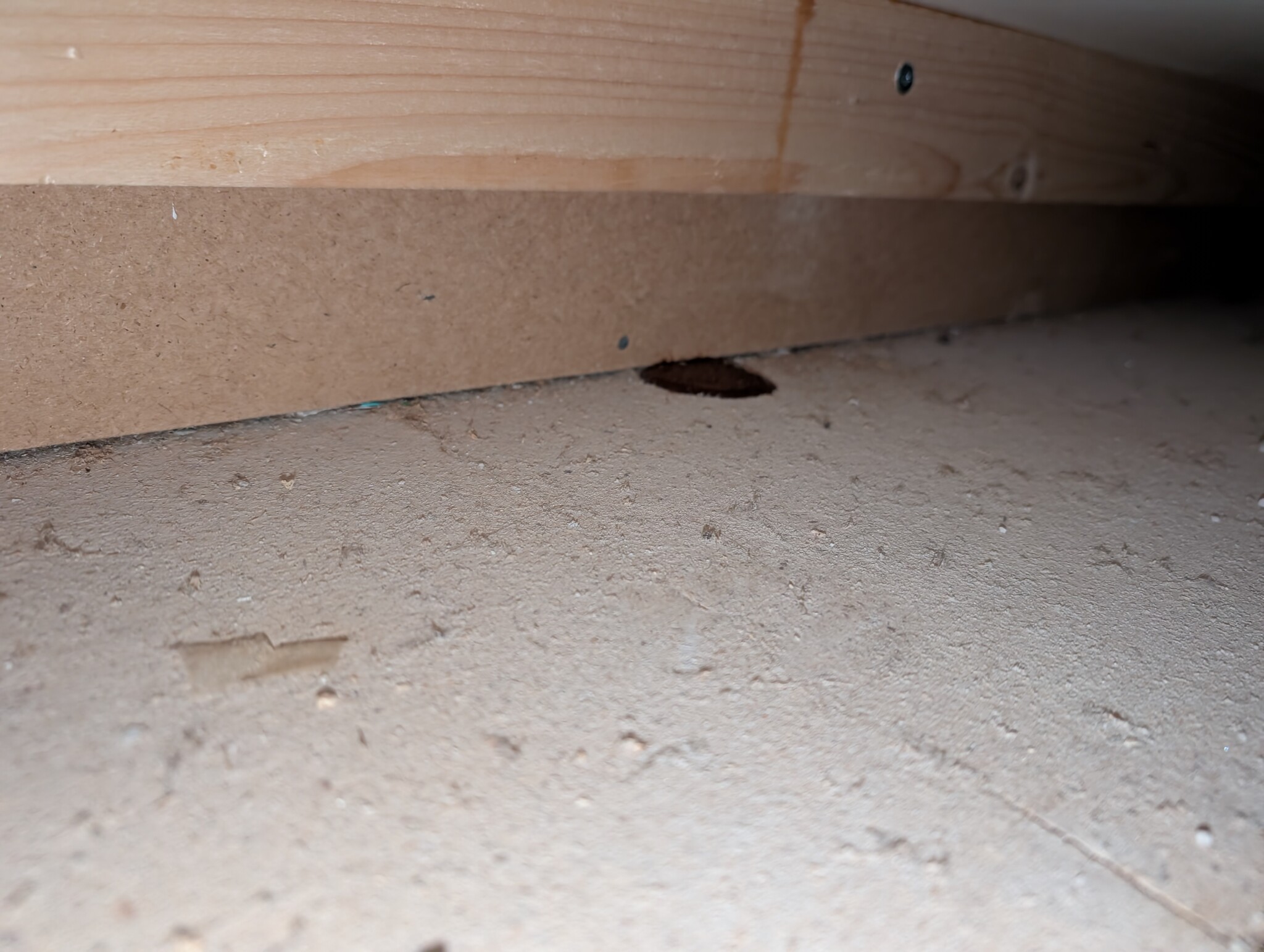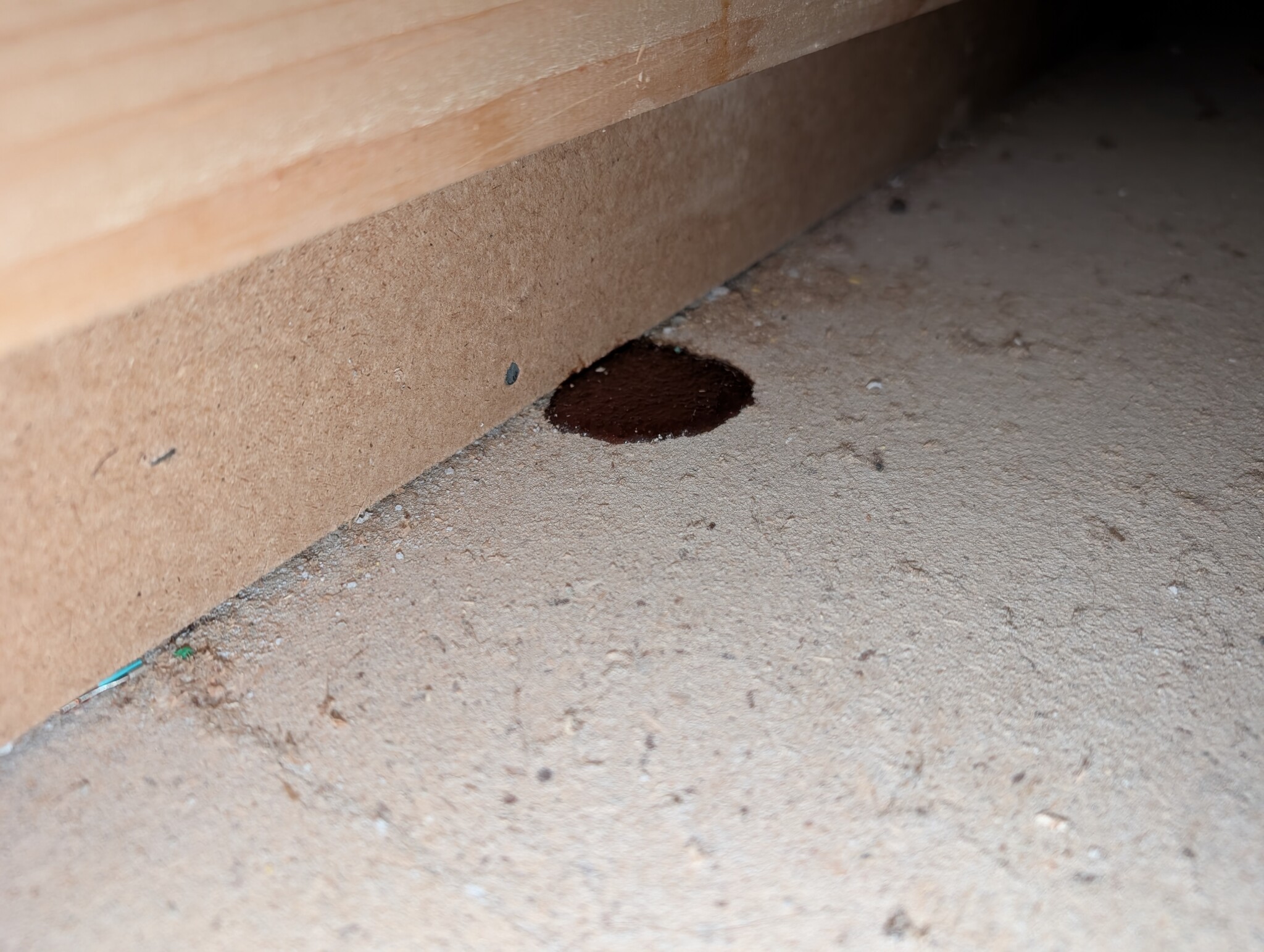 Hej! Har nyligen flyttat in i ett trähus byggt -83 (oisolerad platta med flytande isolerad golvkonstruktion) och upptäckte en mystisk fläck på golvspånet inne under under ett köksskåp. Liknar halvtorkad mörk sirap i färg och konsistens, tycker inte det luktar och ett litet smakprov smakade lite sött men inte solklart just sirap. Ser lite ut som det kan ha runnit och droppat ovanifrån som syns på bild, men jag ser inga spår inne i skåpet ovanför eller vid bänkskivan ovanpå skåpet. Bänkskivan tror jag är oljad stavlimmad valnöt.