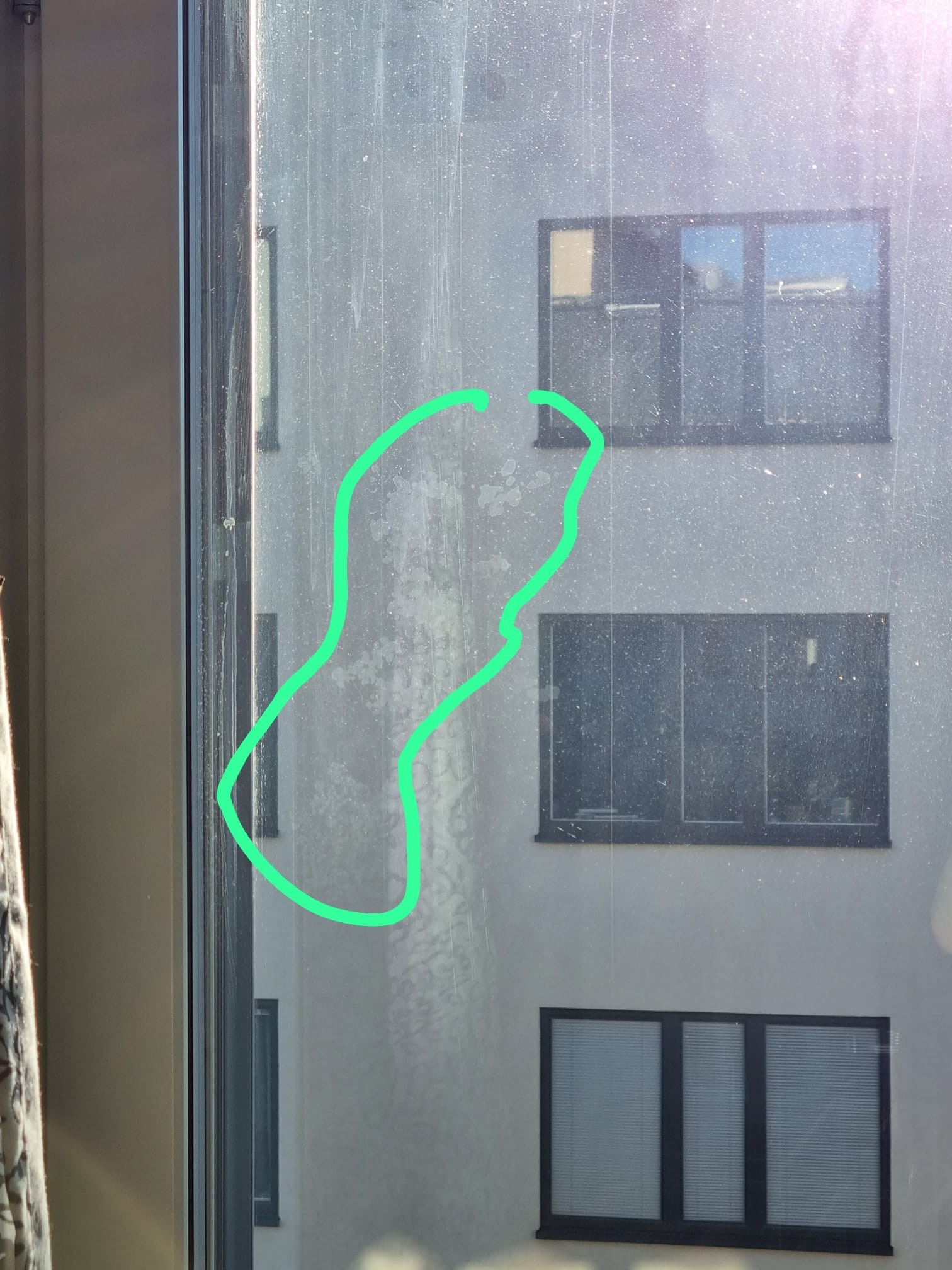 Jag har precis flyttat till en hyresrätt med 2+1-fönster, och tidigare i veckan märkte jag fläckar på fönstret när solen sken igenom. Jag bifogar en bild nedan. Notera att det inringade är det som avses, inte den vanliga smutsen på utsidan (eller reflektionen från min gardin!)
