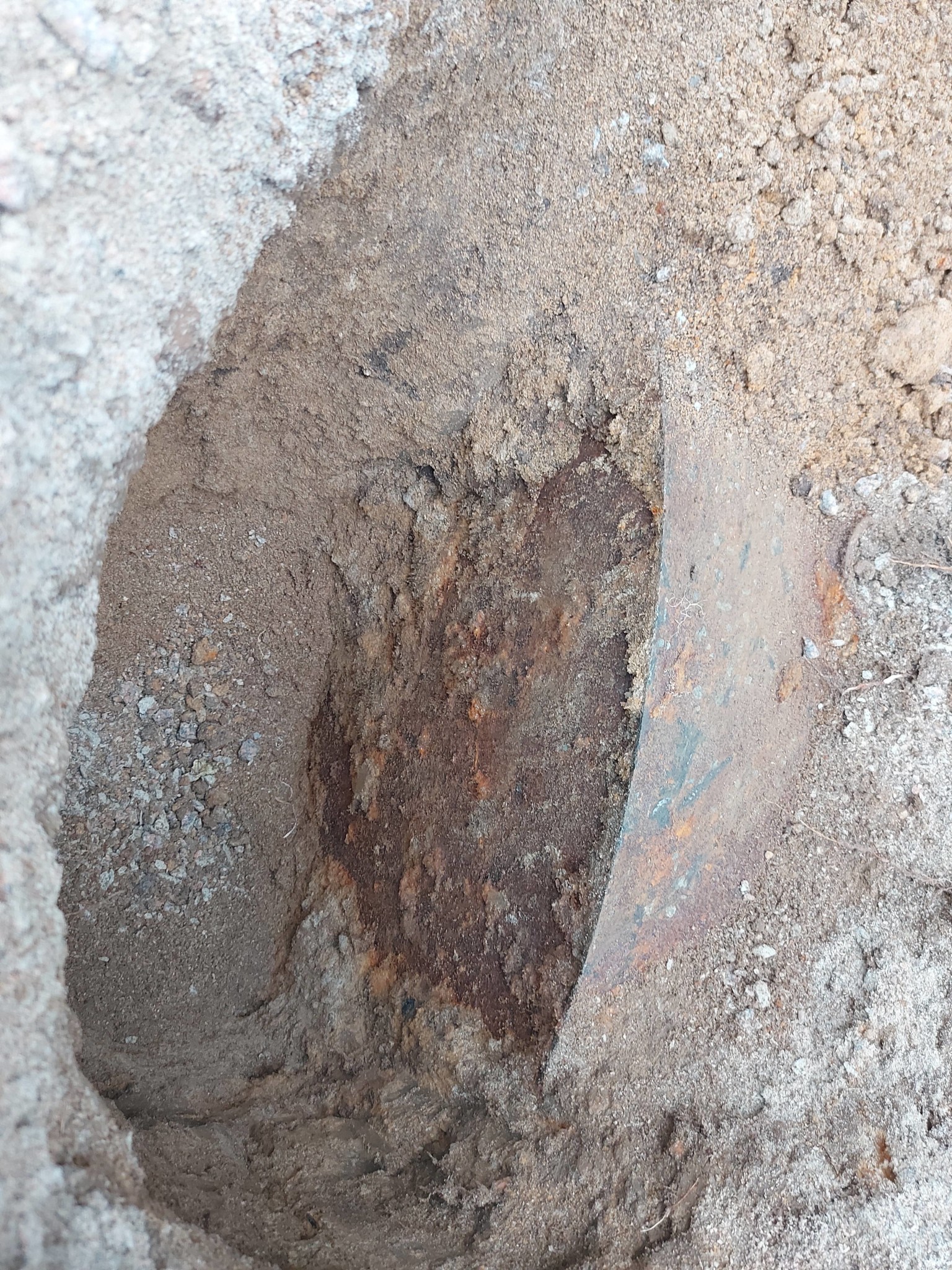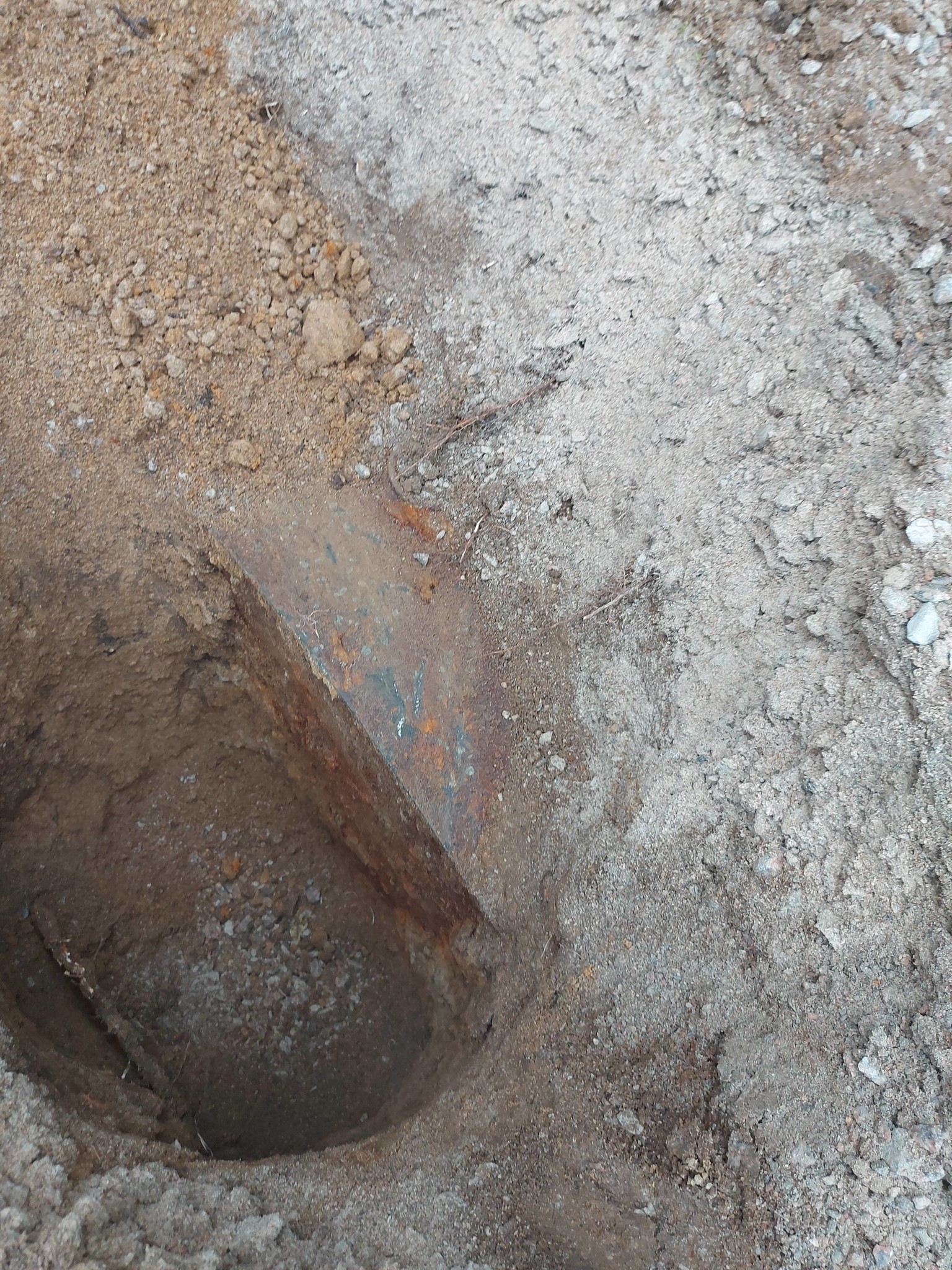 I alla fall. Jag grävde på ett jävla järnrör. Som ser ut att sluta i en vägg. En järnmuff i järnrör eller något.
