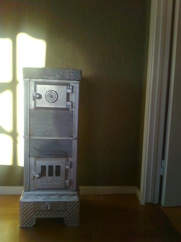 Det finns ett par varianter av luckor på sådana. Jag har använt två olika. Den ena var med en liten övre lucka som på din. Den var man tvungen att ha mycket kort sågad ved till. Min spekulation är att den möjligen är avsedd att elda med koks från början. Är bara veden tillräckligt kort så går det bra. Den värmer bra utan att bli lika het på ytan som en järnkamin. Den är snygg och du tycks ha fått tag på en i ganska bra skick.