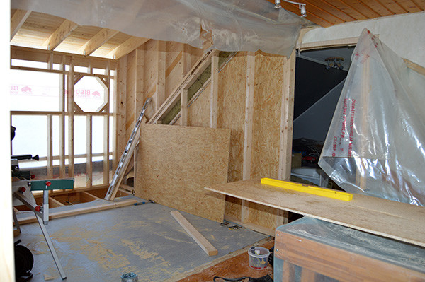 På nästa kupa kapade vi två takstolar ganska högt upp och där tryckte vi upp en kort nockbalk som fördelade ut krafterna på det två närmaste intilliggande takstolarna.