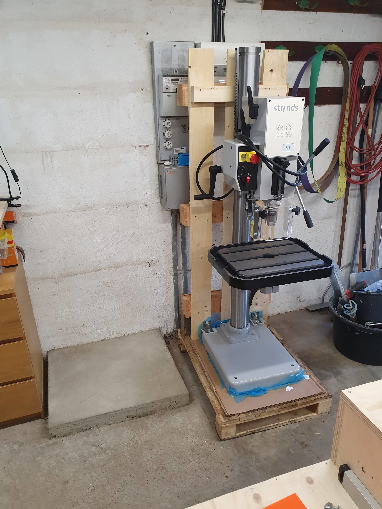 Har gjutit en 80 mm hög betongsula som den här maskinen (185 kg) ska flyttas över till. Pallen den står på nu är 145 mm hög. Så maskinen ska alltså åt sidan och ner.