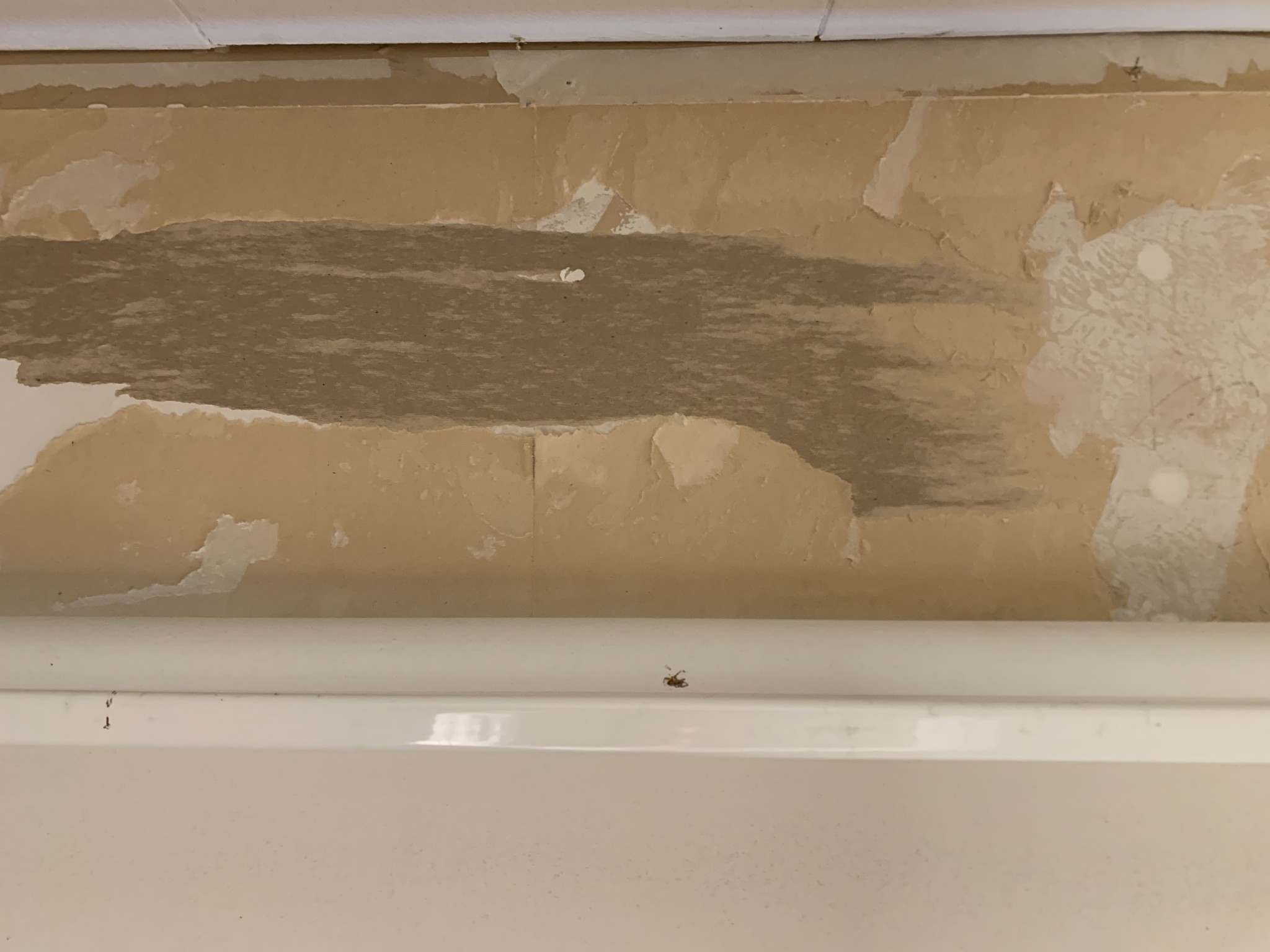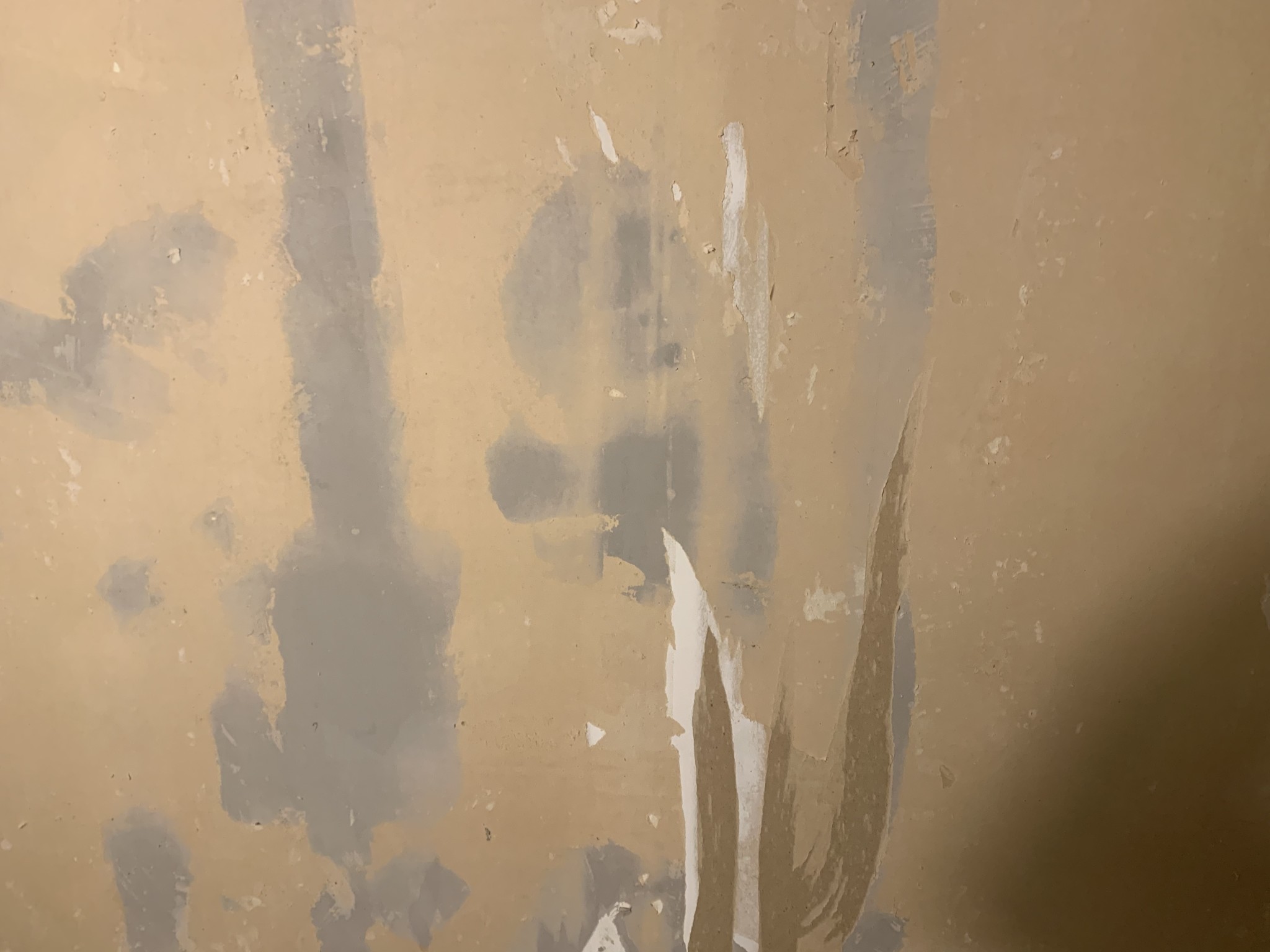 När första lagret tapet lossnar så finns där bakom en brun papp som på vissa ställen är spacklad sedan tidigare. Ångan gör att denna papp även följer med på vissa ställen när tapeten lossnar.