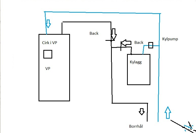 Har kollat temperaturer nu. Ca 16 grader retur och framledning med endast pumpen till kylan. Ca 10 grader när värmepumpens pump går på 20%. Men iomed att det är gjort för att köras på sommaren varför skulle man då ens koppla serie? Sitter givetvis en backventil mellan in och ut på kylslingan.