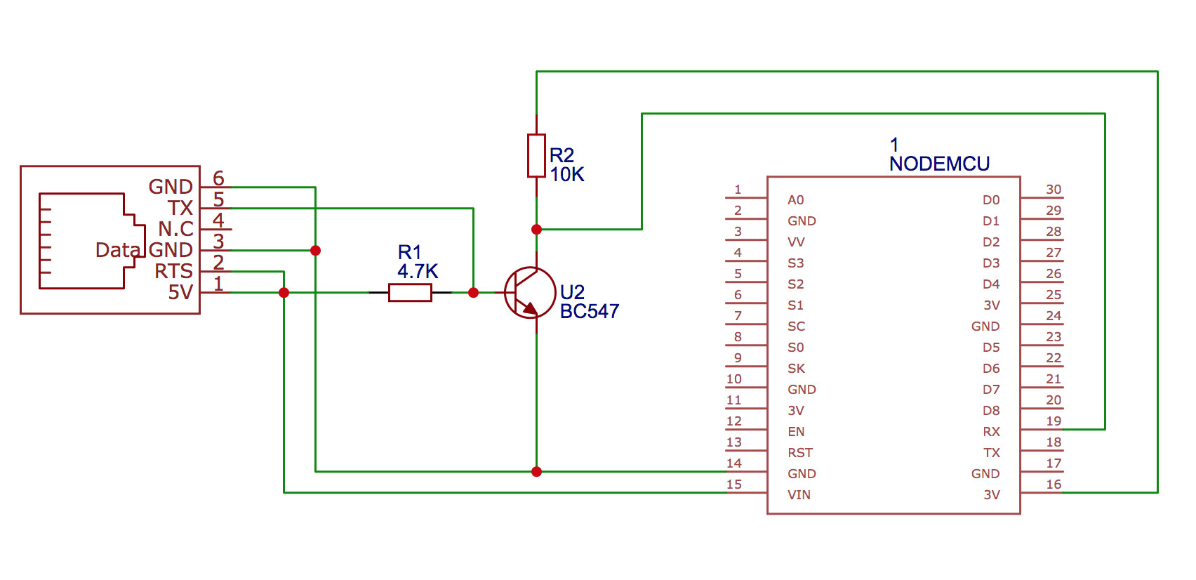 Just ja. Transistorn inverterar signalen också. Men detta kan göras i mjukvara (i mitt fall). Så bara raka kablar emellan, riktigt enkelt med andra ord och man behöver inte kunna något om programmering.J JSten skrev:Jag har ett hemmasnickrat kretskort sedan tidigare som jag använder för att koppla upp onewire termometrar (ds18b20) så att jag kan logga dem. Har 20-30 sensorer liggandes lite här och var i huset, och kanske 8 esp8266 som kopplar upp dessa. Så jag återanvände det kretskortet och la på en krets som inverterar signalen till vanlig uart (likt bilden i @philsson87 inlägg). Som grädde på mosen skrev jag egen firmware (eller snarare anpassade tidigare för temperaturloggning). Definitvt inte den enklaste metoden, utan den lösningen som @philsson87 länkar till är bättre. Men om man vill sätta sig in i esp8266 programmering så är det en bra start.