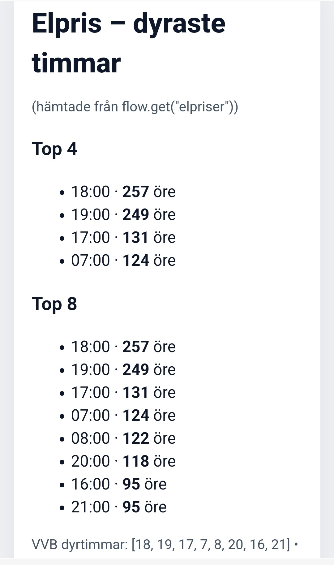 Beräknar och sparar de 8 dyraste timmarna (VVB) och 4 dyraste timmarna (CP).