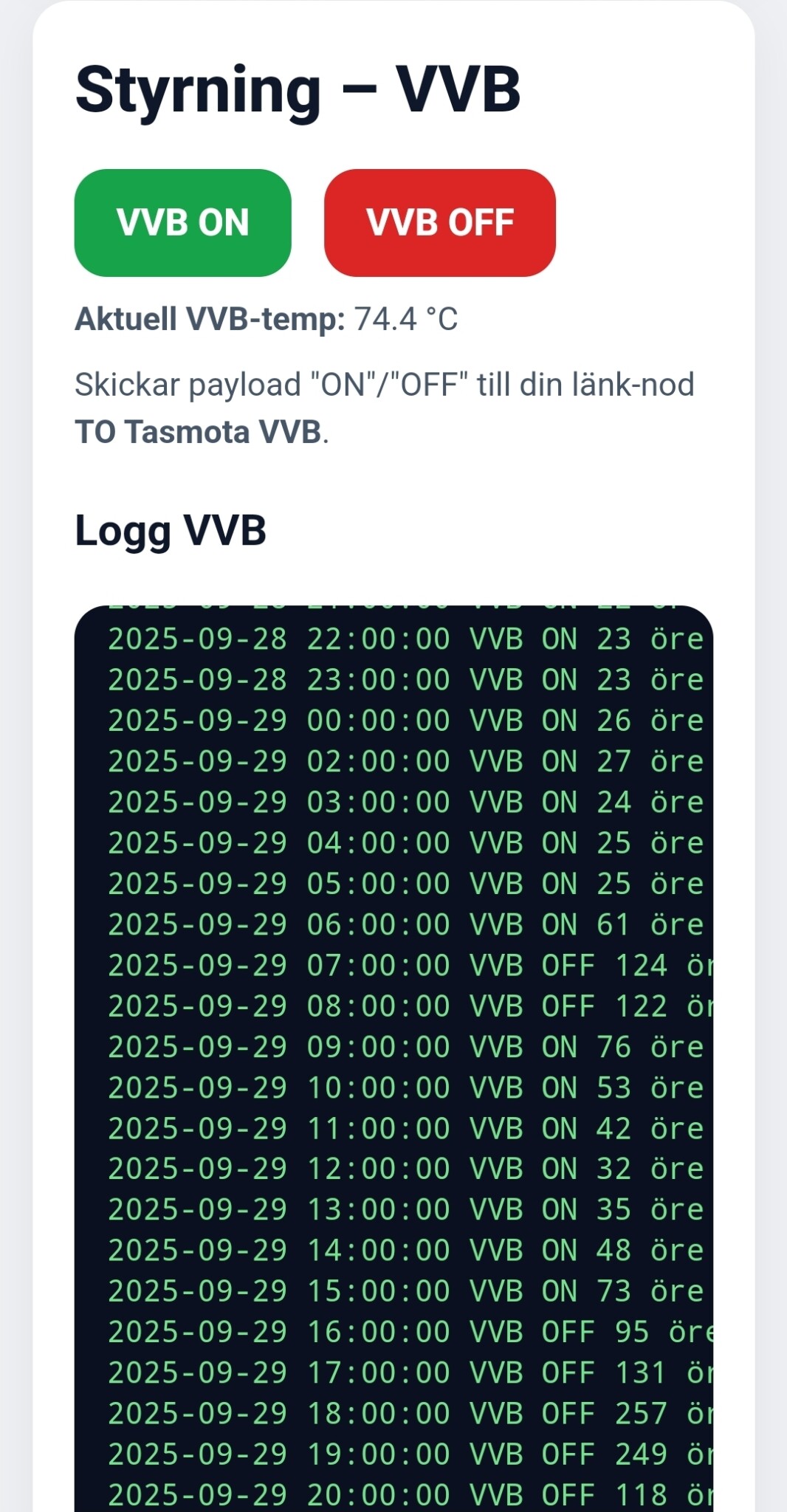 Alla ON/OFF-tillfällen för VVB och CP sparas med elpris och tid (max 100 rader).