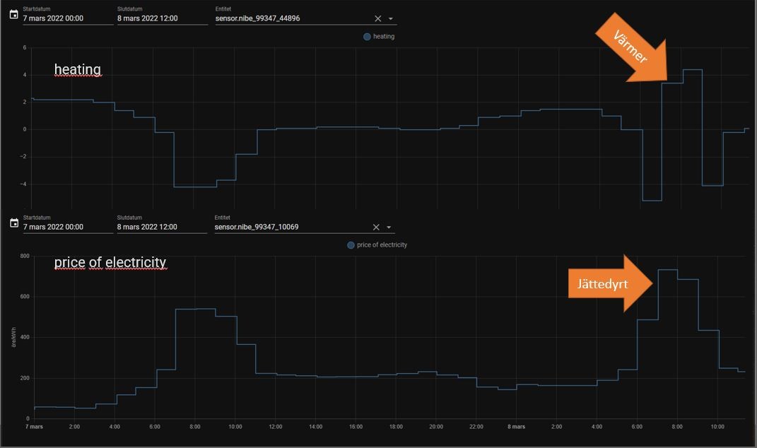 När det är som dyrast så tokvärmer pumpen. Sett på två individer, Nibe F370.