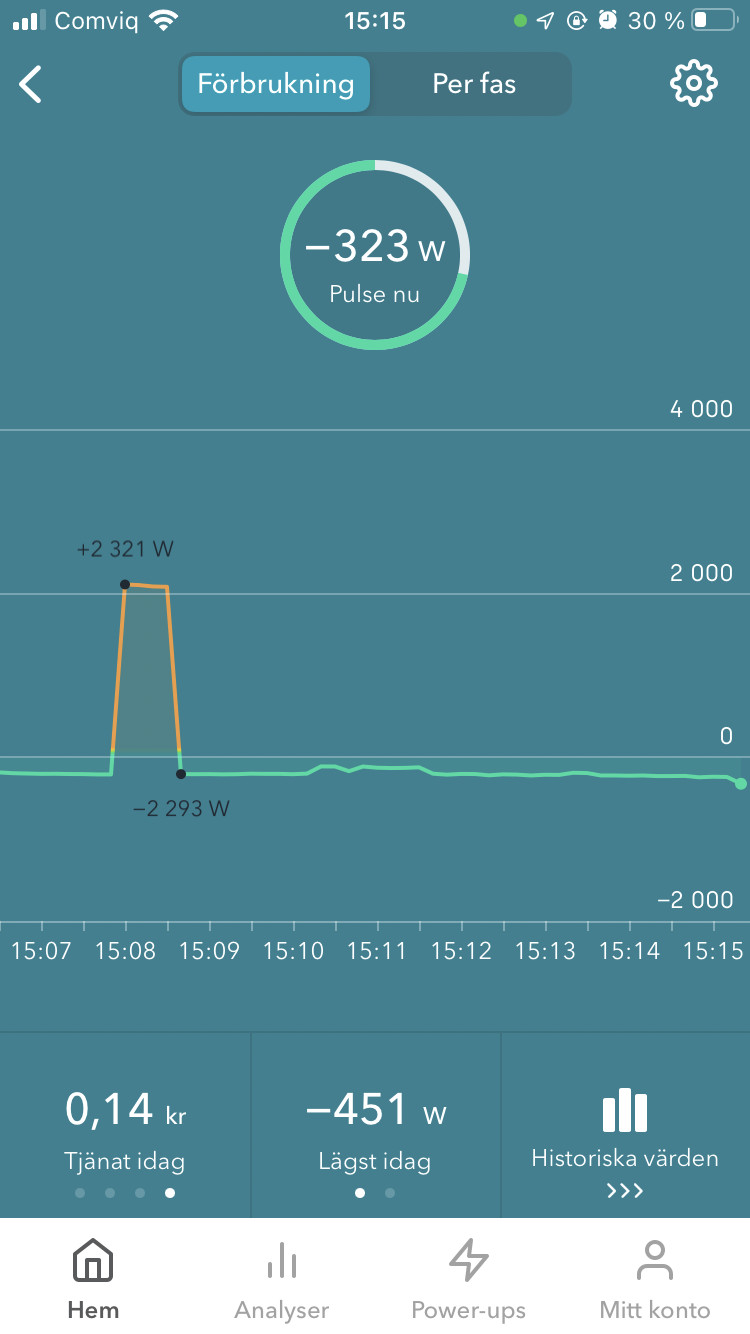 Kom nyss igång med Puls: Den visar negativt värde om solcellerna skickar ut el på nätet. Men visar även liten sammanställning av dagens högsta/lägsta förbrukning, inkännande pengar, förbrukning idag, kostnad idag.Allan J skrev:
