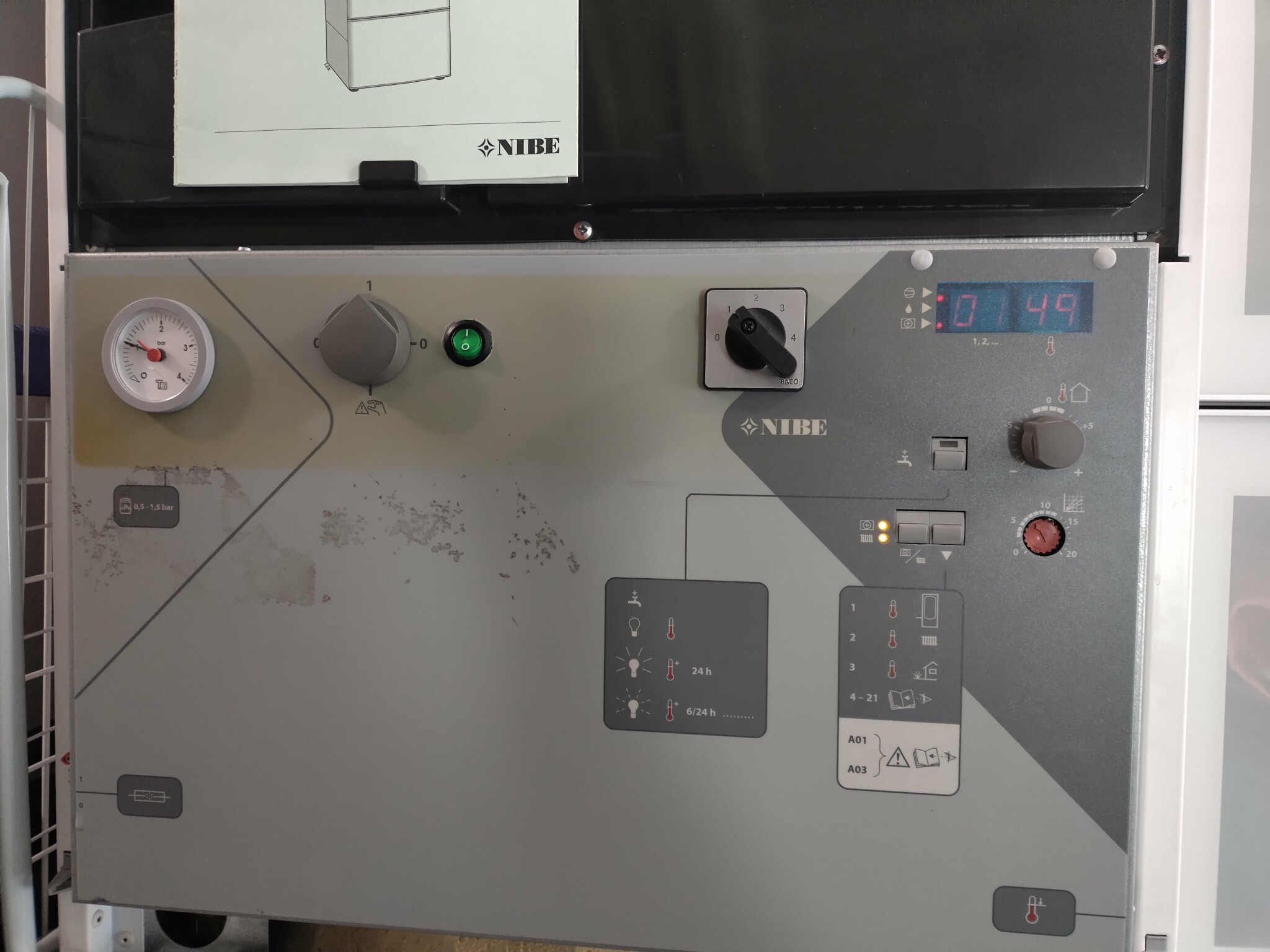 Och slutligen så den gröna knappen på fronten är för att kunna stänga av circulationspumpen samtidigt som tilläggsvärme är på, för kompressorn har ju skurit ihop för länge sen. Men man kanske inte vill höra på brummet från pumpen då ingen värme behövs annat än till tappvatten.