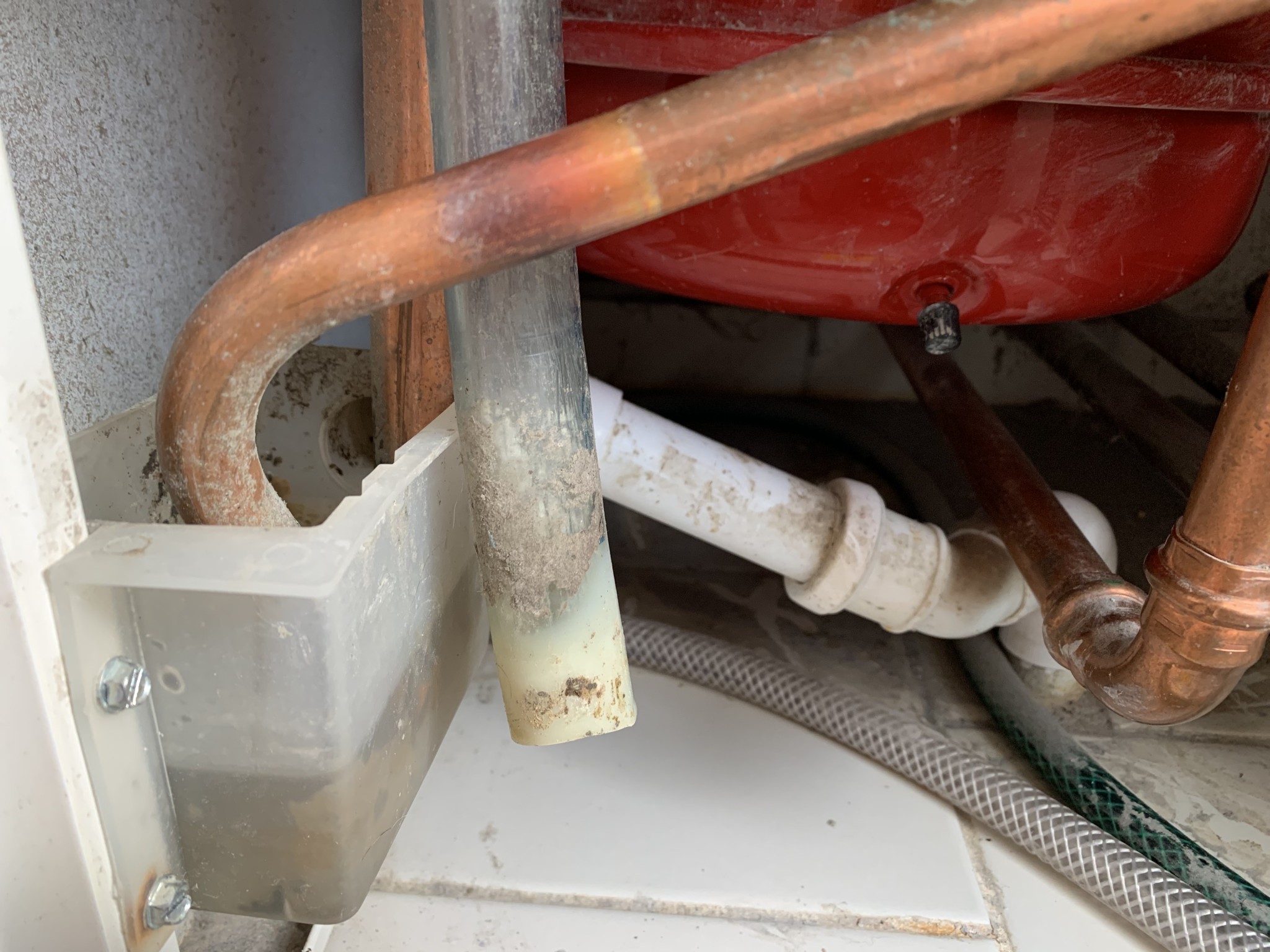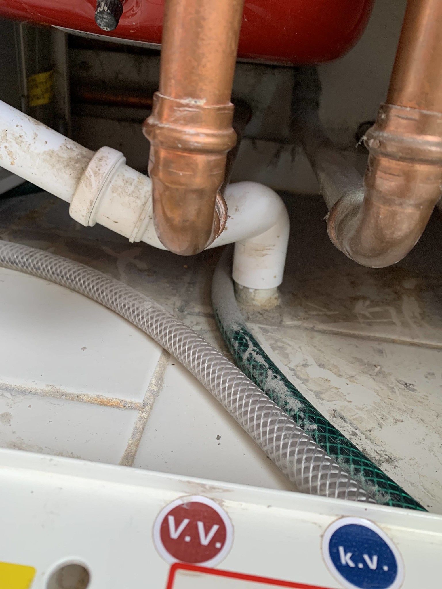 Säkerhetsventilen för värmesystemet sitter till vänster och är riktad neråt. Kanske är den av den nya typen på 2,5 bar till skillnad mot äldre årsmodeller av 310P där den satt högre upp.
