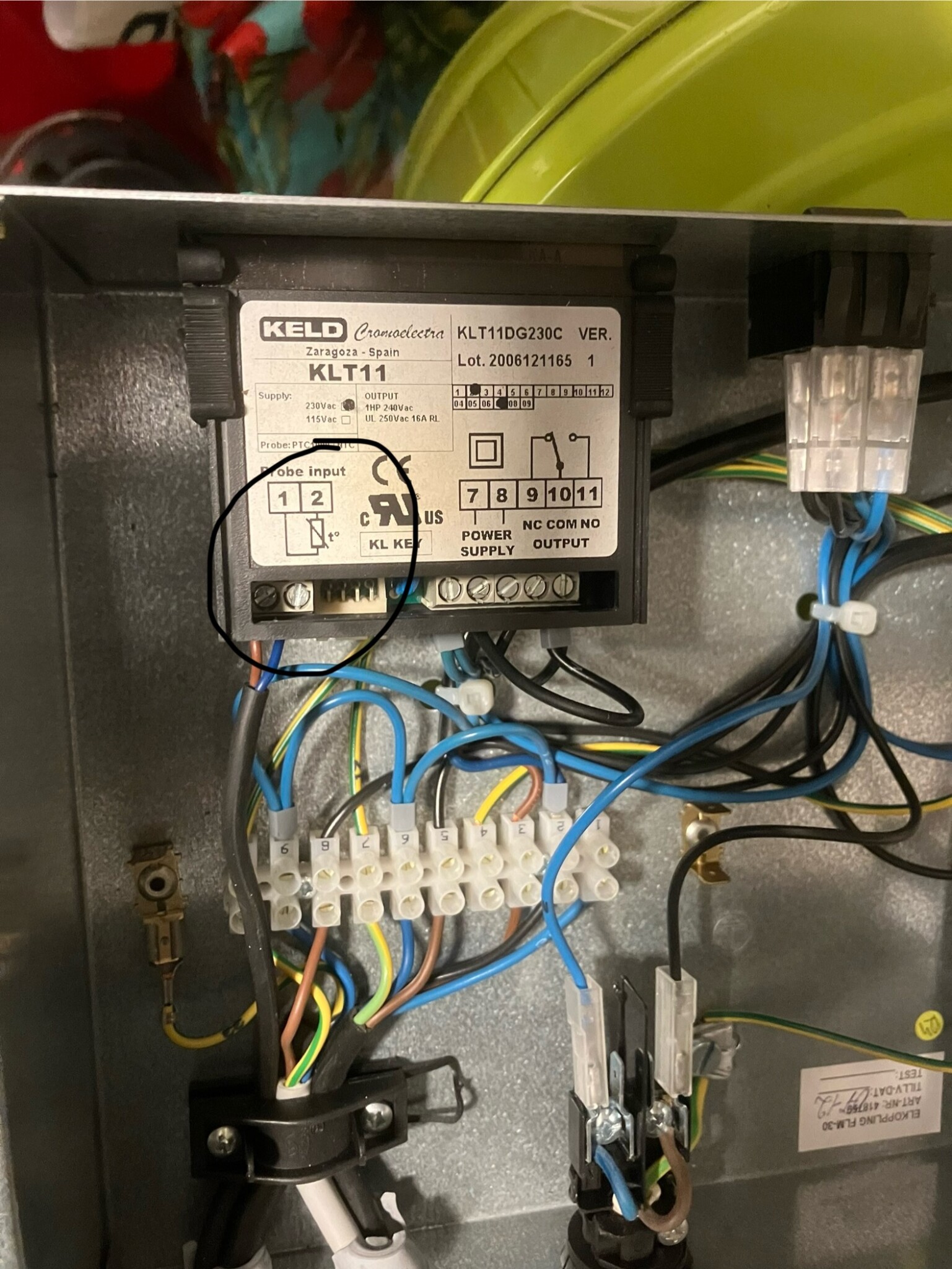 Hittade bilden på innanmätet. Inringat är ”probe” som är termistorkabeln. Koppla ur dessa så tystnar klickandet. Ställde även av cirkulationen.