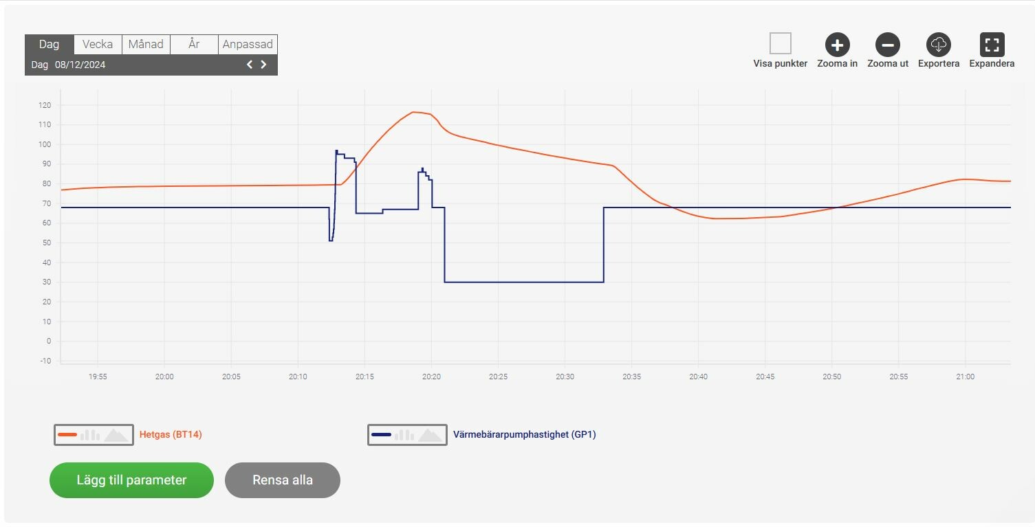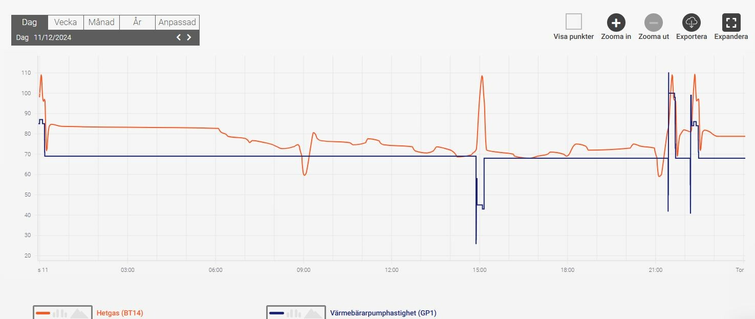 Är inne på samma spår men frågan är hur/vart man ändrar inställningarna för Värmebärarpumphastighet (GP1)?J jonaserik skrev:Bara skit med att VB-pumpen ska ändra fart. då blir det sådär. Se till att få pumpen att gå konstant, sätt bort auto och om det går en fart på min ca 60 % som prov. När den går ner i fart så kan det bli att den inte orkar med riktigt att trycka ut flödet som ska vara. Då kan dom delar som är längst bort, kanske inte få det flöde som behövs. Åter igen. Bara skit som någon tror sig är bra.