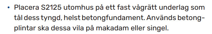 Hej, Ska gjuta betongplatta till S2125 imorgon och hade tänkt ha lite lutning på den för att vattnet ska rinna av. Jag förutsätter att man kan justera dom fyra fötterna för att få den stå i våg? Hittade dock inget om det i installationshandboken: https://proffs.nibe.se/nibedocuments/31231/631673-1.pdf Någon som vet? Annars får jag gjuta en helt plan platta. EDIT: Eller iofs det står att plattan ska vara vågrätt. Så det kanske inte går att justera fötterna?