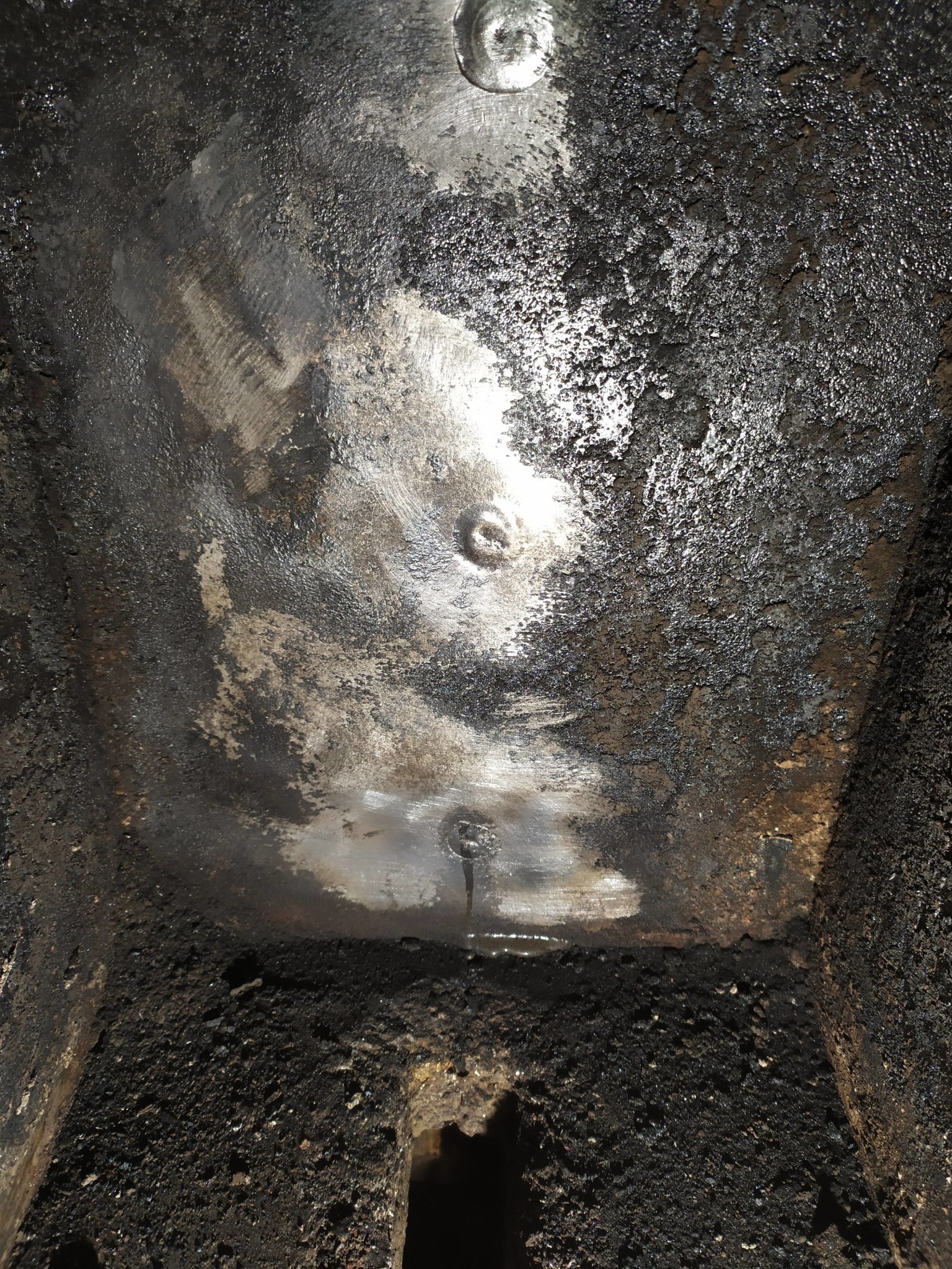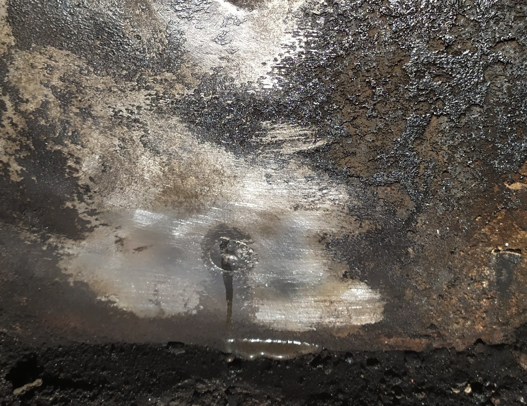 Hålet är ganska litet och det blir en synåls stor stråle när jag fyller pannan med vatten som sedan övergår i drop när trycket sjunker något. På bilden kan ni se att jag har slipat rent lite med stålborste runt läckaget samt dem 2 andra liknande cirklarna.