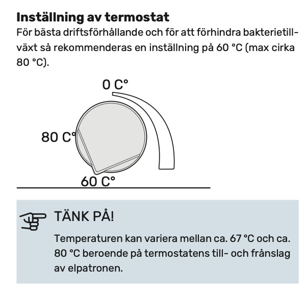 Har en vvb enligt ovan där skydd löste ut, detta har kunnat återställas och inte löst ut igen. Men har väldigt svårt att förstå hur vredet ska stå för 65 grader så jag sen med blandningsventilen kan hitta en lagom temp. Efter återställning så brassa den på till typ 80 grader. Visst termostaten kan vara kass men undrar om någon kan skicka en bild på sin inställning? Tycker manualen visar väldigt märkligt då man ska vrida mot typ max