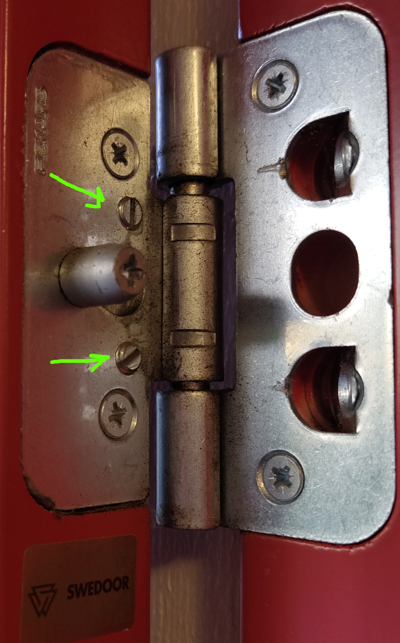 De två skruvarna dina pilar pekar på justerar dörrbladet i sidled.