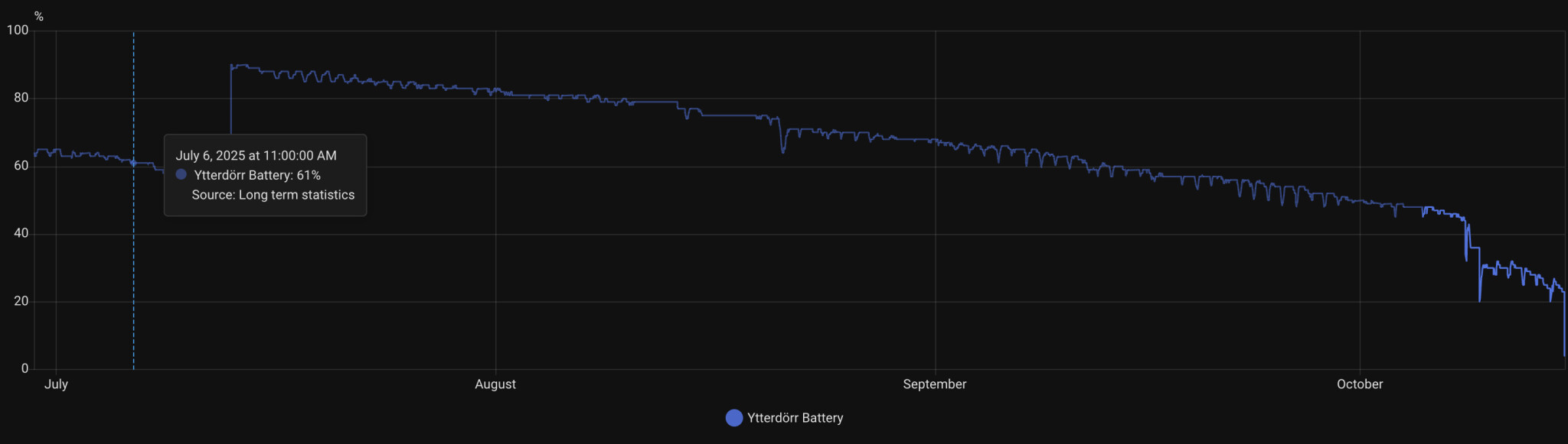 Börjar bli riktigt less på min Nimly Pro nu. 3e gången på ett år som jag måste byta batteri. Kika på grafen så ser ni att något händer för några veckor sen, batteriet töms alldeles för snabbt. Kanske att kylan påverkar men borde inte vara så drastiskt. Sen ser det inte ut som att den rapporterar batterinivån korrekt heller, redan runt 50% så börjar låset krångla och fungerar inte att låsa upp längre med kod/fingeravtryck.