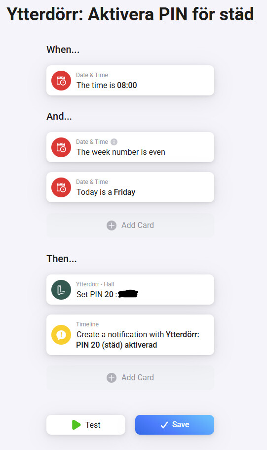 Nej, i ett flöde i Homey finns massa olika typer av villkor och händelser som kan styra ett flöde. Ett exempel; Varannan fredag vill jag aktivera koden för de som kommer och städar. På eftermiddagen tar jag bort samma kod (rensar den minnesplatsen). Flödet är det samma hela tiden och behöver aldrig ändras:N nissenhj skrev: