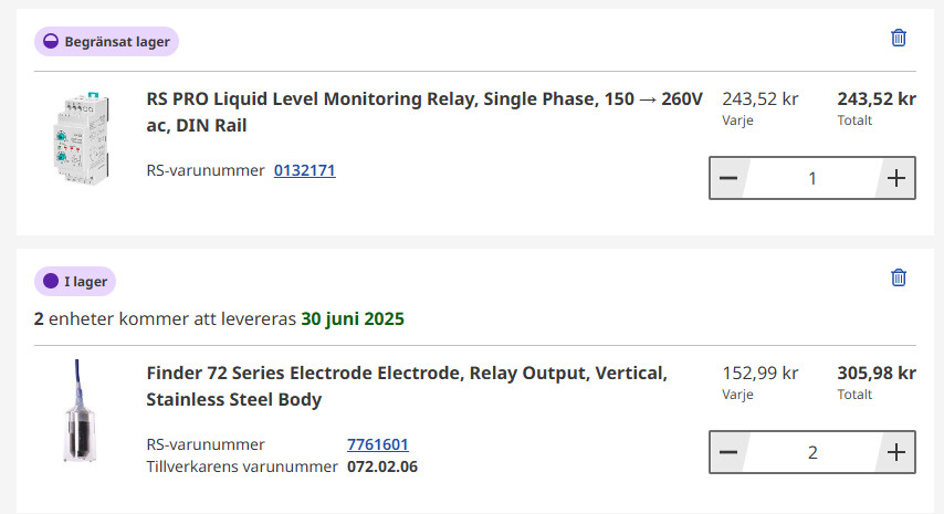 För ändamålet avsett nivåövervakningrelä med två sonder. Lockande lösning som känns robust men har jag valt rätt komponenter?