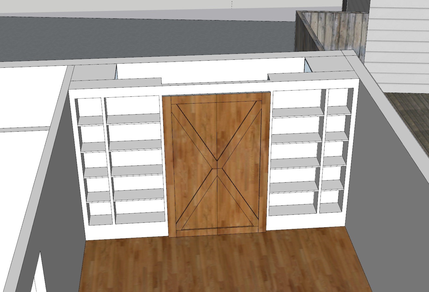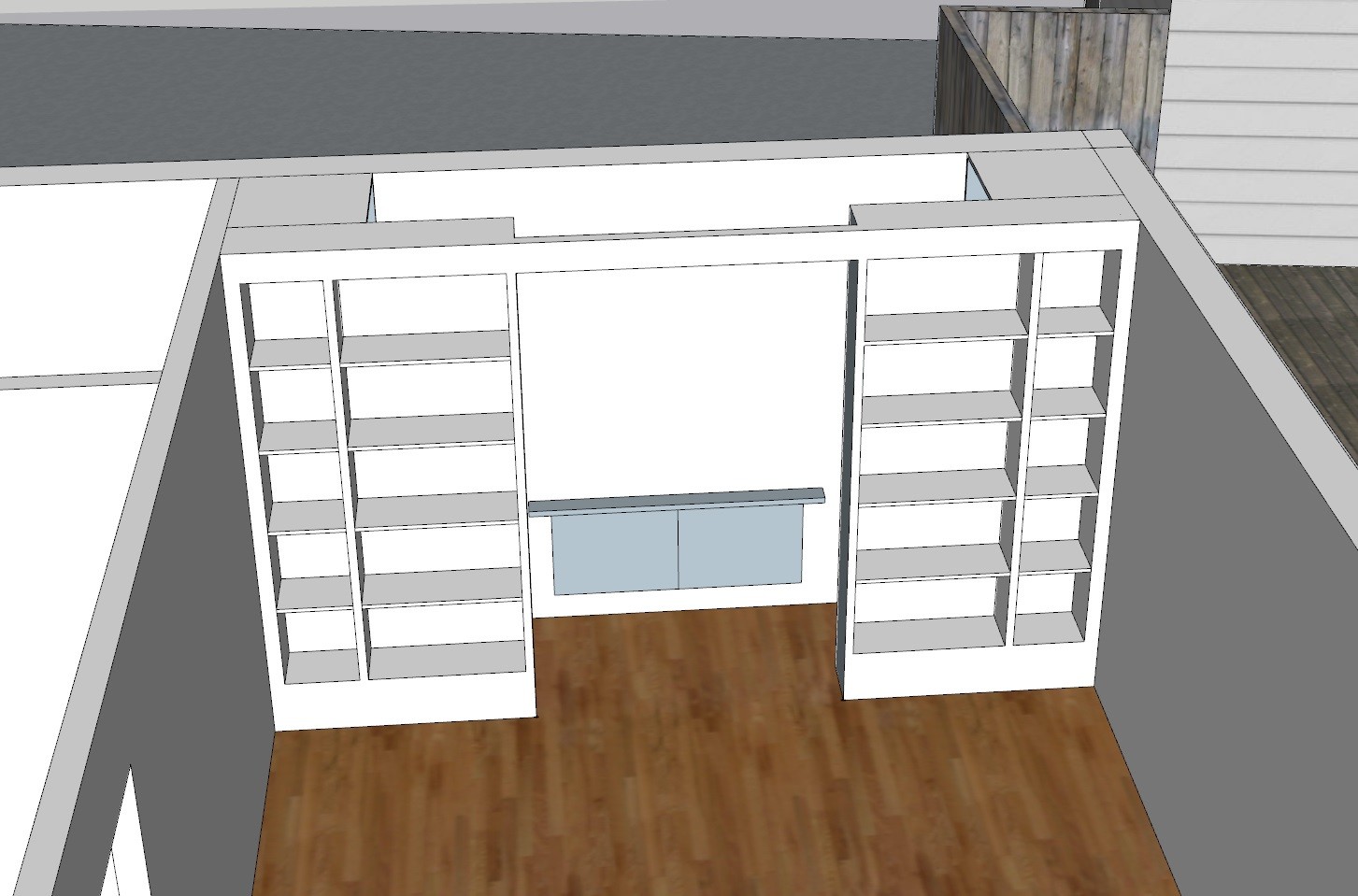 Jag är i planeringsstadiet av ett projekt där jag tänkt bygg in 2+2 Billybokhyllor med ett mindre förvaringsutrymme bakom bokhyllorna. I förvaringsutrymmet kommer det finns plats för ett fällbart skrivbord (så att en arbetsplats med dator kan gömmas) samt en garderob på vardera sida. V.g se bild 1.